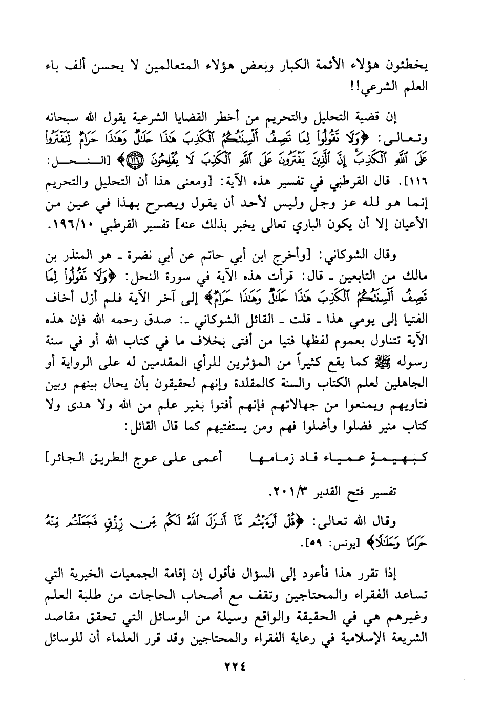 إن قضية التحليل والتحريم من أخطر القضايا الشرعية يقول الله سبحانه وتعالى: (وَلَا تَقُولُوا لِمَا تَصِفُ أَلْسِنَتُكُمُ الْكَذِبَ هَذَا حَلَالٌ وَهَذَا حَرَامٌ لِتَفْتَرُوا عَلَى اللَّهِ الْكَذِبَ إِنَّ الَّذِينَ يَفْتَرُونَ عَلَى اللَّهِ الْكَذِبَ لَا يُفْلِحُونَ) سورة النحل الآية 116. قال القرطبي في تفسير هذه الآية: [ومعنى هذا أن التحليل والتحريم إنما هو لله عز وجل وليس لأحد أن يقول ويصرح بهذا في عين من الأعيان إلا أن يكون الباري تعالى يخبر بذلك عنه] تفسير القرطبي 10/ 196.