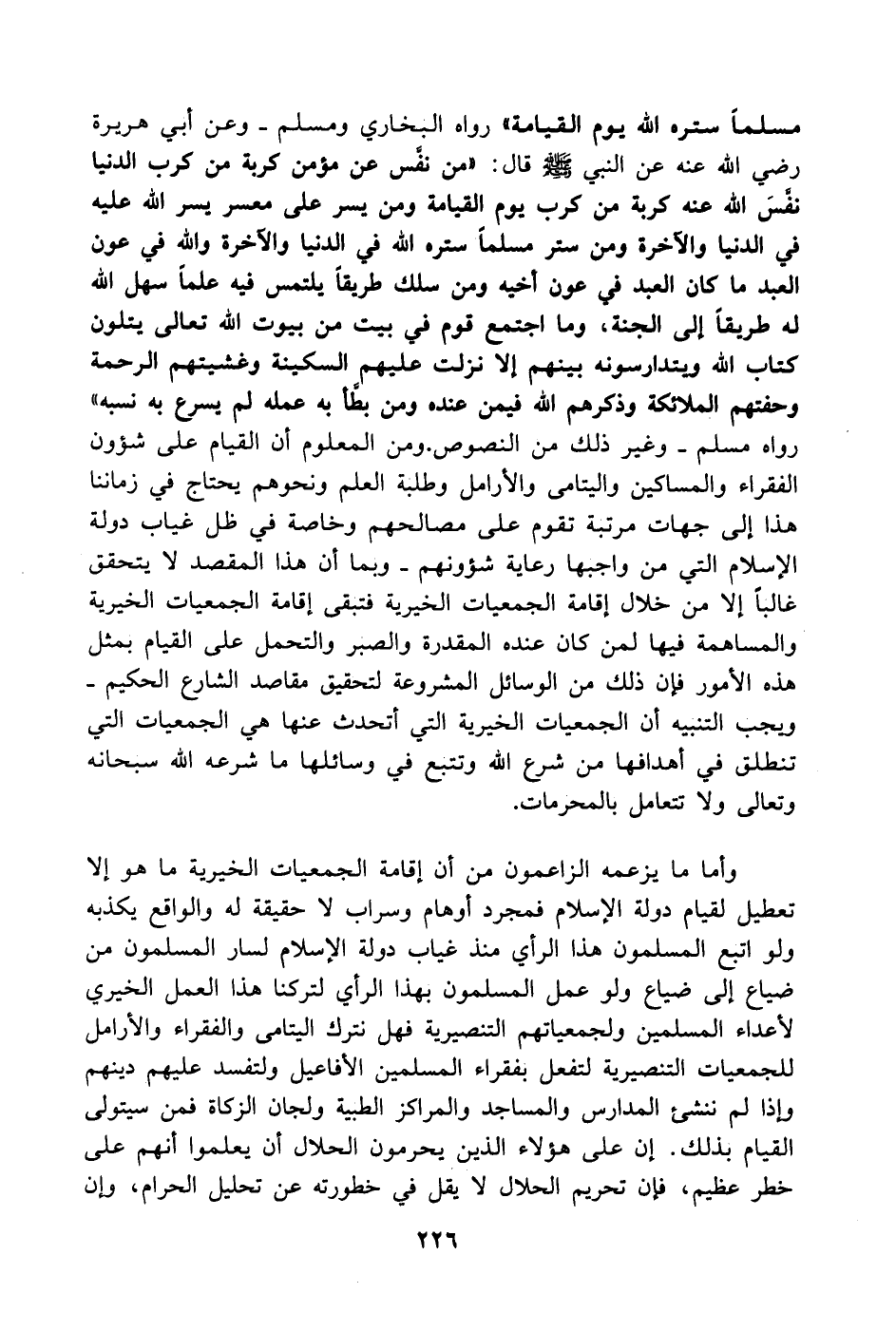 مسلماً ستره الله يوم القيامة) رواه البخاري ومسلم. وعن أبي هريرة - رضي الله عنه - عن النبي - صَلَّى اللهُ عَلَيْهِ وَسَلَّمَ - قال: (من نفَّس عن مؤمن كربة من كرب الدنيا نفَّسَ اللهُ عنه كربة من كرب يوم القيامة ومن يسر على معسر يسر الله عليه في الدنيا والآخرة ومن ستر مسلماً ستره الله في الدنيا والآخرة والله في عون العبد ما كان العبد في عون أخيه ومن سلك طريقاً يلتمس فيه علماً سهل الله له طريقاً إلى الجنة. وما اجتمع قوم في بيت من بيوت الله تعالى يتلون كتاب الله ويتدارسونه بينهم إلا نزلت عليهم السكينة وغشيتهم الرحمة وحفتهم الملائكة وذكرهم الله فيمن عنده ومن بطَّأ به عمله لم يسرع به نسبه) رواه مسلم. وغير ذلك من النصوص. ومن المعلوم أن القيام على شؤون الفقراء والمساكين واليتامى والأرامل وطلبة العلم ونحوهم يحتاج في زماننا هذا إلى جهات مرتبة تقوم على مصالحهم وخاصة في ظل غياب دولة الإسلام التي من واجبها رعاية شؤونهم. وبما أن هذا المقصد لا يتحقق غالباً إلا من خلال إقامة الجمعيات الخيرية فتبقى إقامة الجمعيات الخيرية والمساهمة فيها لمن كان عنده المقدرة والصبر والتحمل على القيام بمثل هذه الأمور فإن ذلك من الوسائل المشروعة لتحقيق