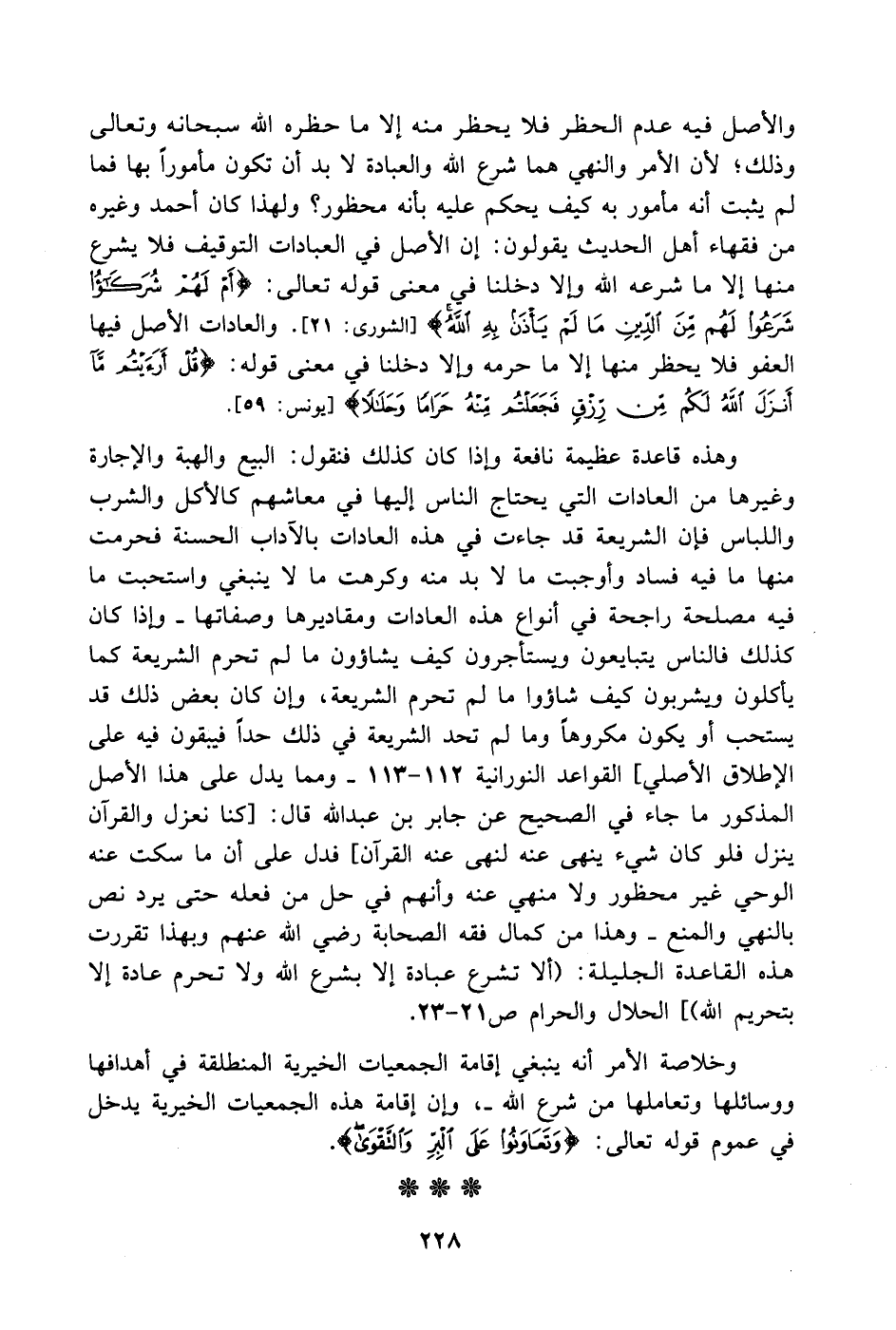 وهذه قاعدة عظيمة نافعة وإذا كان كذلك فنقول: البيع والهبة والإجارة وغيرها من العادات التي يحتاج الناس إليها في معاشهم كالأكل والشرب واللباس فإن الشريعة قد جاءت في هذه العادات بالآداب الحسنة فحرمت منها ما فيه فساد وأوجبت ما لا بد منه وكرهت ما لا ينبغي واستحبت ما فيه مصلحة راجحة في أنواع هذه العادات ومقاديرها وصفاتها. وإذا كان كذلك فالناس يتبايعون ويستأجرون كيف يشاؤون ما لم تحرم الشريعة كما يأكلون ويشربون كيف شاؤوا ما لم تحرم الشريعة وإن كان بعض ذلك قد يستحب أو يكون مكروهاً وما لم تحد الشريعة في ذلك حداً فيبقون فيه على الإطلاق الأصلي] القواعد النورانية 112 - 113. ومما يدل على هذا الأصل المذكور ما جاء في الصحيح عن جابر بن عبد الله قال: [كنا نعزل والقرآن ينزل فلو كان شيء ينهى عنه لنهى عنه القرآن] فدل على أن ما سكت عنه الوحي غير محظور ولا منهي عنه وأنهم في حل من فعله حتى يرد نص بالنهي والمنع. وهذا من كمال فقه الصحابة رضي الله عنهم وبهذا تقررت هذه القاعدة الجليلة: (ألا تشرع عبادة إلا بشرع الله ولا تحرم عادة إلا بتحريم الله)] الحلال والحرام ص21 - 23.