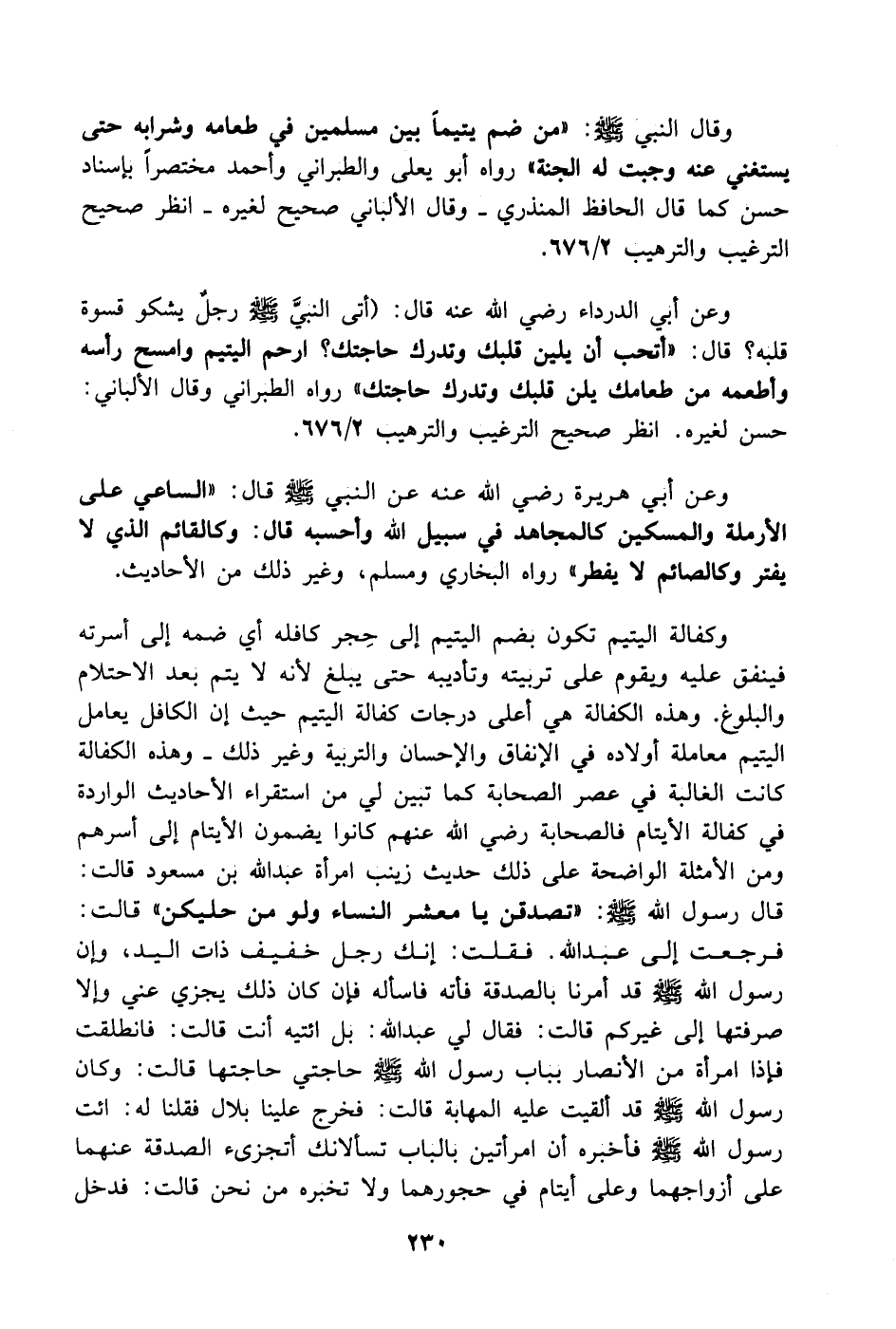 وقال النبي - صَلَّى اللهُ عَلَيْهِ وَسَلَّمَ -: (من ضم يتيماً بين مسلمين في طعامه وشرابه حتى يستغني عنه وجبت له الجنة) رواه أبو يعلى والطبراني وأحمد مختصراً بإسناد حسن كما قال الحافظ المنذري. وقال الألباني صحيح لغيره. انظر صحيح الترغيب والترهيب 2/ 676.