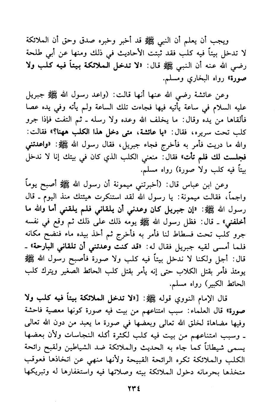 وعن ابن عباس قال: (أخبرتني ميمونة أن رسول الله - صَلَّى اللهُ عَلَيْهِ وَسَلَّمَ - أصبح يوماً واجماً، فقالت ميمونة: يا رسول الله لقد استنكرت هيئتك منذ اليوم. قال رسول الله - صَلَّى اللهُ عَلَيْهِ وَسَلَّمَ -: إن جبريل كان وعدني أن يلقاني فلم يلقني أما والله ما أخلفني. قال: فظل رسول الله - صَلَّى اللهُ عَلَيْهِ وَسَلَّمَ - يومه ذلك على ذلك ثم وقع في نفسه جرو كلب تحت فسطاط لنا فأمر به فأخرج ثم أخذ بيده ماء فنضح مكانه فلما أمسى لقيه جبريل فقال له: قد كنت وعدتني أن تلقاني البارحة. قال: أجل ولكنا لا ندخل بيتاً فيه كلب ولا صورة فأصبح رسول الله - صَلَّى اللهُ عَلَيْهِ وَسَلَّمَ - يومئذ فأمر بقتل الكلاب حتى إنه يأمر بقتل كلب الحائط الصغير ويترك كلب الحائط الكبير) رواه مسلم.