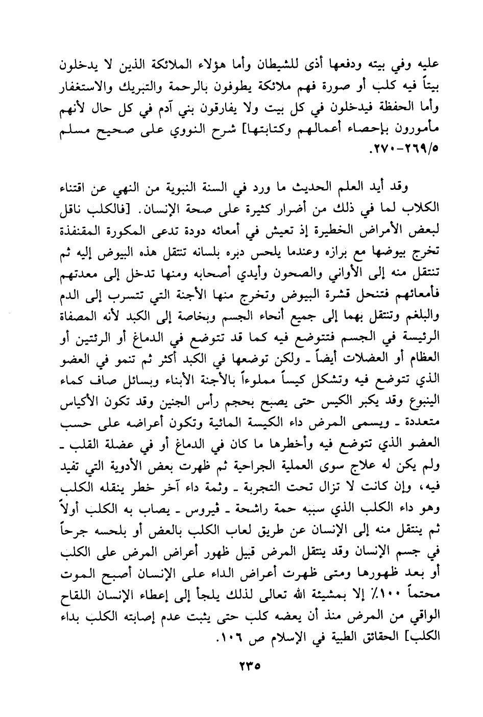 وقد أيد العلم الحديث ما ورد في السنة النبوية من النهي عن اقتناء الكلاب لما في ذلك من أضرار كثيرة على صحة الإنسان. [فالكلب ناقل لبعض الأمراض الخطيرة إذ تعيش في أمعائه دودة تدعى المكورة المقنفذة تخرج بيوضها مع برازه وعندما يلحس دبره بلسانه تنتقل هذه البيوض إليه ثم تنتقل منه إلى الأواني والصحون وأيدي أصحابه ومنها تدخل إلى معدتهم فأمعائهم فتنحل قشرة البيوض وتخرج منها الأجنة التي تتسرب إلى الدم والبلغم وتنتقل بهما إلى جميع أنحاء الجسم وبخاصة إلى الكبد لأنه المصفاة الرئيسة في الجسم فتتوضع فيه كما قد تتوضع في الدماغ أو الرئتين أو العظام أو العضلات أيضاً. ولكن توضعها في الكبد أكثر ثم تنمو في العضو الذي تتوضع فيه وتشكل كيساً مملوءً بالأجنة الأبناء وبسائل صاف كماء الينبوع وقد يكبر الكيس حتى يصبح بحجم رأس الجنين وقد تكون الأكياس متعددة. ويسمى المرض داء الكيسة المائية وتكون أعراضه على حسب العضو الذي تتوضع فيه وأخطرها ما كان في الدماغ أو في عضلة القلب. ولم يكن له علاج سوى العملية الجراحية ثم ظهرت بعض الأدوية التي تفيد فيه وإن كانت لا تزال تحت التجربة. وثمة داء آخر خطر ينقله الكلب وهو داء الكلب الذي سببه حمة راشحة - فيروس - يصاب به الكلب أولاً ثم ينتقل منه إلى الإنسان عن طريق لعاب الكلب بالعض أو بلحسه جرحاً في جسم الإنسان وقد ينتقل المرض قبيل ظهور أعراض المرض على الكلب أو بعد ظهورها ومتى ظهرت أعراض الداء على الإنسان أصبح الموت محتماً 100% إلا بمشيئة الله تعالى لذلك يلجأ إلى إعطاء الإنسان اللقاح الواقي من المرض منذ أن يعضه كلب حتى يثبت عدم إصابته الكلب بداء الكلب] الحقائق الطبية في الإسلام ص 106.