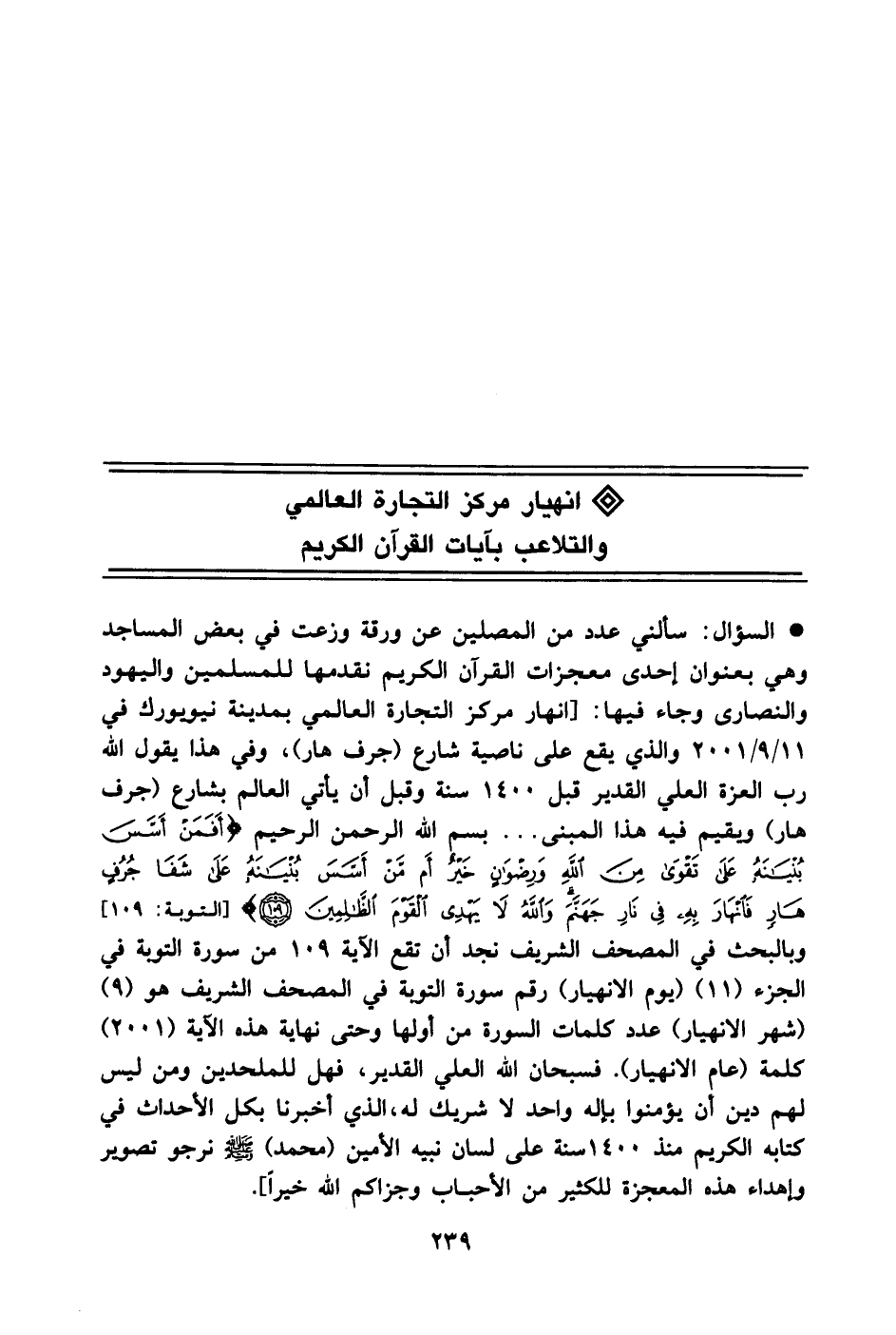 السؤال: سألني عدد من المصلين عن ورقة وزعت في بعض المساجد وهي بعنوان إحدى معجزات القرآن الكريم نقدمها للمسلمين واليهود والنصارى وجاء فيها: [انهار مركز التجارة العالمي بمدينة نيويورك في 11/ 9/2001 والذي يقع على ناصية شارع (جرف هار)، وفي هذا يقول الله رب العزة العلي القدير قبل 1400سنة وقبل أن يأتي العالم بشارع (جرف هار) ويقيم فيه هذا المبنى ... بسم الله الرحمن الرحيم (أَفَمَنْ أَسَّسَ بُنْيَانَهُ عَلَى تَقْوَى مِنَ اللَّهِ وَرِضْوَانٍ خَيْرٌ أَمْ مَنْ أَسَّسَ بُنْيَانَهُ عَلَى شَفَا جُرُفٍ هَارٍ فَانْهَارَ بِهِ فِي نَارِ جَهَنَّمَ وَاللَّهُ لَا يَهْدِي الْقَوْمَ الظَّالِمِينَ) سورة التوبة آية 109 وبالبحث في المصحف الشريف نجد أن تقع الآية 109 من سورة التوبة في الجزء (11) (يوم الانهيار) رقم سورة التوبة في المصحف الشريف هو (9) (شهر الانهيار) عدد كلمات السورة من أولها وحتى نهاية هذه الآية (2001) كلمة (عام الانهيار). فسبحان الله العلي القدير، فهل للملحدين ومن ليس لهم دين أن يؤمنوا بإله واحد لا شريك له، الذي أخبرنا بكل الأحداث في كتابه الكريم منذ 1400سنة على لسان نبيه الأمين