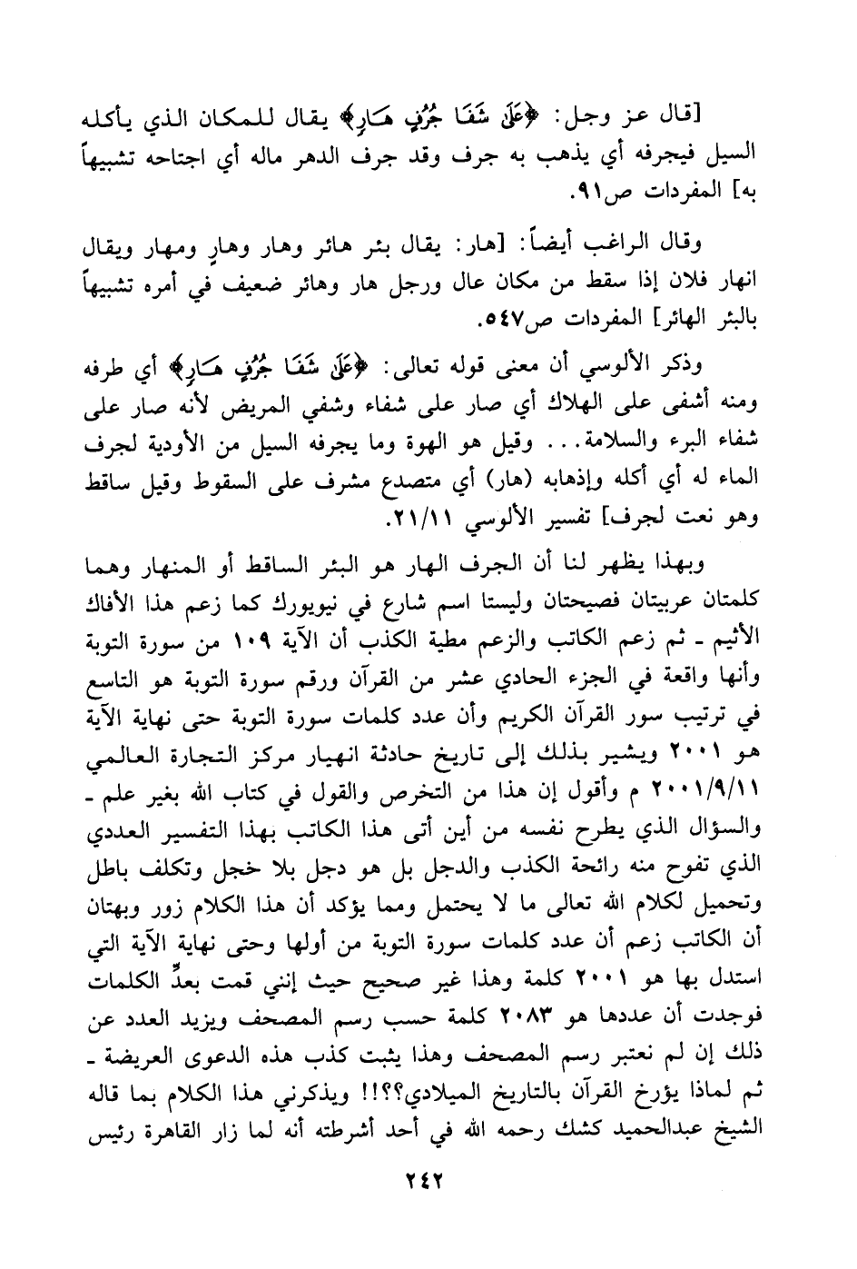 وبهذا يظهر لنا أن الجرف الهار هو البئر الساقط أو المنهار وهما كلمتان عربيتان فصيحتان وليستا اسم شارع في نيويورك كما زعم هذا الأفاك الأثيم. ثم زعم الكاتب والزعم مطية الكذب أن الآية 109 من سورة التوبة وأنها واقعة في الجزء الحادي عشر من القرآن ورقم سورة التوبة هو التاسع في ترتيب سور القرآن الكريم وأن عدد كلمات سورة التوبة حتى نهاية الآية هو 2001 ويشير بذلك إلى تاريخ حادثة انهيار مركز التجارة العالمي 11/ 9/2001 م وأقول إن هذا من التخرص والقول في كتاب الله بغير علم. والسؤال الذي يطرح نفسه من أين أتى هذا الكاتب بهذا التفسير العددي الذي تفوح منه رائحة الكذب والدجل بل هو دجل بلا خجل وتكلف باطل وتحميل لكلام الله تعالى ما لا يحتمل ومما يؤكد أن هذا الكلام زور وبهتان أن الكاتب زعم أن عدد كلمات سورة التوبة من أولها وحتى نهاية الآية التي استدل بها هو 2001 كلمة وهذا غير صحيح حيث إنني قمت بعدِّ الكلمات فوجدت أن عددها هو 2083 كلمة حسب رسم المصحف ويزيد العدد عن ذلك إن لم نعتبر رسم المصحف وهذا يثبت كذب هذه الدعوى العريضة. ثم لماذا يؤرخ القرآن بالتاريخ الميلادي؟؟!! ويذكرني هذا الكلام بما قاله الشيخ عبد الحميد كشك رحمه الله في أحد أشرطته أنه لما زار القاهرة رئيس