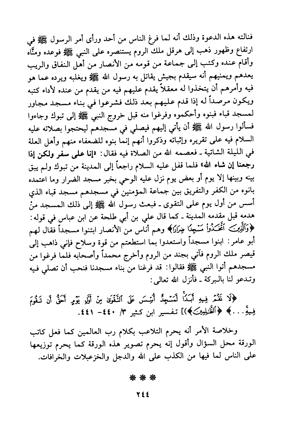 عنده لأداء كتبه ويكون مرصداً له إذا قدم عليهم بعد ذلك فشرعوا في بناء مسجد مجاور لمسجد قباء فبنوه وأحكموه وفرغوا منه قبل خروج النبي - صَلَّى اللهُ عَلَيْهِ وَسَلَّمَ - إلى تبوك وجاءوا فسألوا رسول الله - صَلَّى اللهُ عَلَيْهِ وَسَلَّمَ - أن يأتي إليهم فيصلي في مسجدهم ليحتجوا بصلاته عليه السلام فيه على تقريره وإثباته وذكروا أنهم إنما بنوه للضعفاء منهم وأهل العلة في الليلة الشاتية. فعصمه الله من الصلاة فيه فقال: (إنا على سفر ولكن إذا رجعنا إن شاء الله) فلما قفل عليه السلام راجعاً إلى المدينة من تبوك ولم يبق بينه وبينها إلا يوم أو بعض يوم نزل عليه الوحي بخبر مسجد الضرار وما اعتمده بانوه من الكفر والتفريق بين جماعة المؤمنين في مسجدهم مسجد قباء الذي أسس من أول يوم على التقوى. فبعث رسول الله - صَلَّى اللهُ عَلَيْهِ وَسَلَّمَ - إلى ذلك المسجد منْ هدمه قبل مقدمه المدينة. كما قال علي بن أبي طلحة عن ابن عباس في قوله: (وَالَّذِينَ اتَّخَذُوا مَسْجِدًا ضِرَارًا) وهم أناس من الأنصار ابتنوا مسجداً فقال لهم أبو عامر: ابنوا مسجداً واستعدوا بما استطعتم من قوة وسلاح فإني ذاهب إلى قيصر ملك الروم فآتي بجند من الروم وأخرج محمداً وأصحابه فلما فرغوا من مسجدهم أتوا النبي - صَلَّى اللهُ عَلَيْهِ وَسَلَّمَ - فقالوا: قد فرغنا من بناء مسجدنا فنحب أن تصلي فيه وتدعو لنا بالبركة. فأنزل الله تعالى: