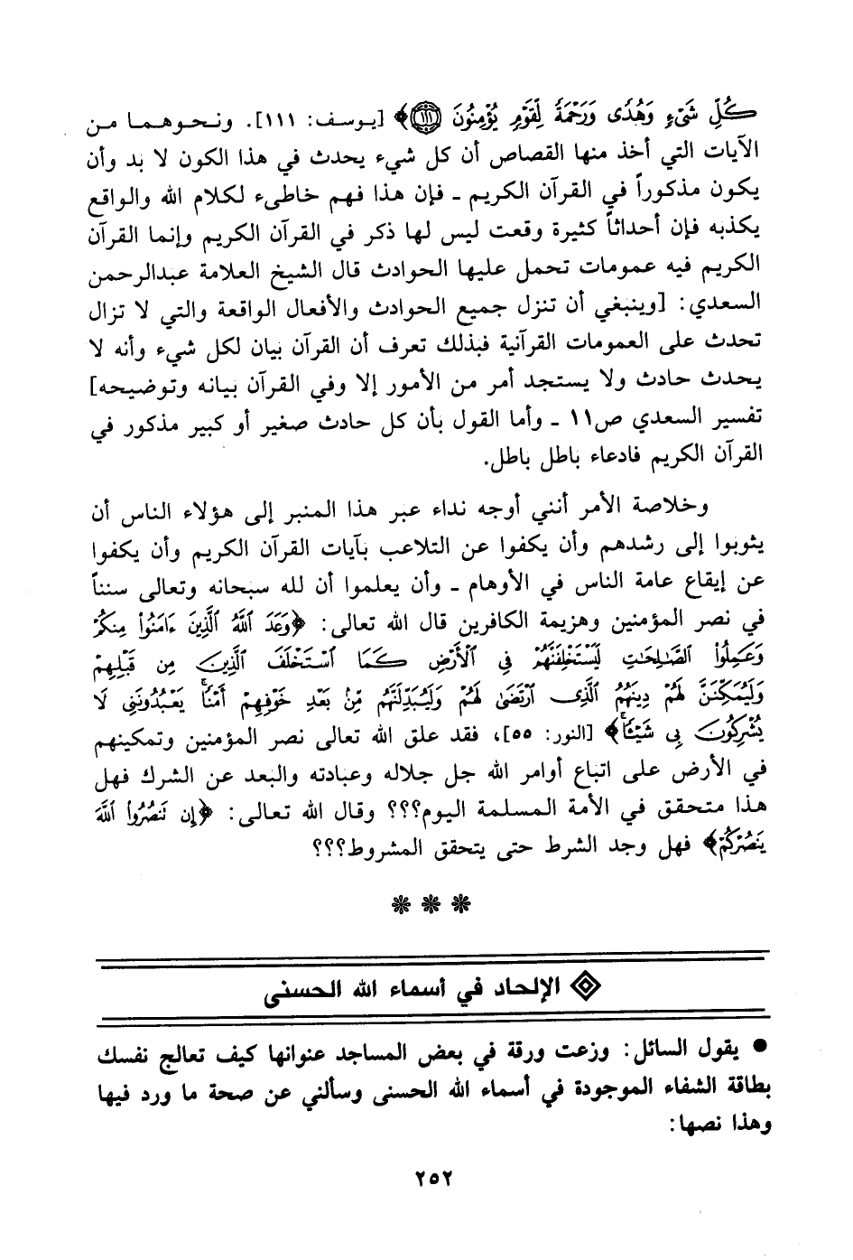 وخلاصة الأمر أنني أوجه نداء عبر هذا المنبر إلى هؤلاء الناس أن يثوبوا إلى رشدهم وأن يكفوا عن التلاعب بآيات القرآن الكريم وأن يكفوا عن إيقاع عامة الناس في الأوهام. وأن يعلموا أن لله سبحانه وتعالى سنناً في نصر المؤمنين وهزيمة الكافرين قال الله تعالى: (وَعَدَ اللَّهُ الَّذِينَءَامَنُوا مِنْكُمْ وَعَمِلُوا الصَّالِحَاتِ لَيَسْتَخْلِفَنَّهُمْ فِي الْأَرْضِ كَمَا اسْتَخْلَفَ الَّذِينَ مِنْ قَبْلِهِمْ وَلَيُمَكِّنَنَّ لَهُمْ دِينَهُمُ الَّذِي ارْتَضَى لَهُمْ وَلَيُبَدِّلَنَّهُمْ مِنْ بَعْدِ خَوْفِهِمْ أَمْنًا يَعْبُدُونَنِي لَا يُشْرِكُونَ بِي شَيْئًا) سورة النور الآية 55، فقد علق الله تعالى نصر المؤمنين وتمكينهم في الأرض على اتباع أوامر الله جل جلاله وعبادته والبعد عن الشرك فهل هذا متحقق في الأمة المسلمة اليوم؟؟؟ وقال الله تعالى: (إِنْ تَنْصُرُوا اللَّهَ يَنْصُرْكُمْ) فهل وجد الشرط حتى يتحقق المشروط؟؟؟