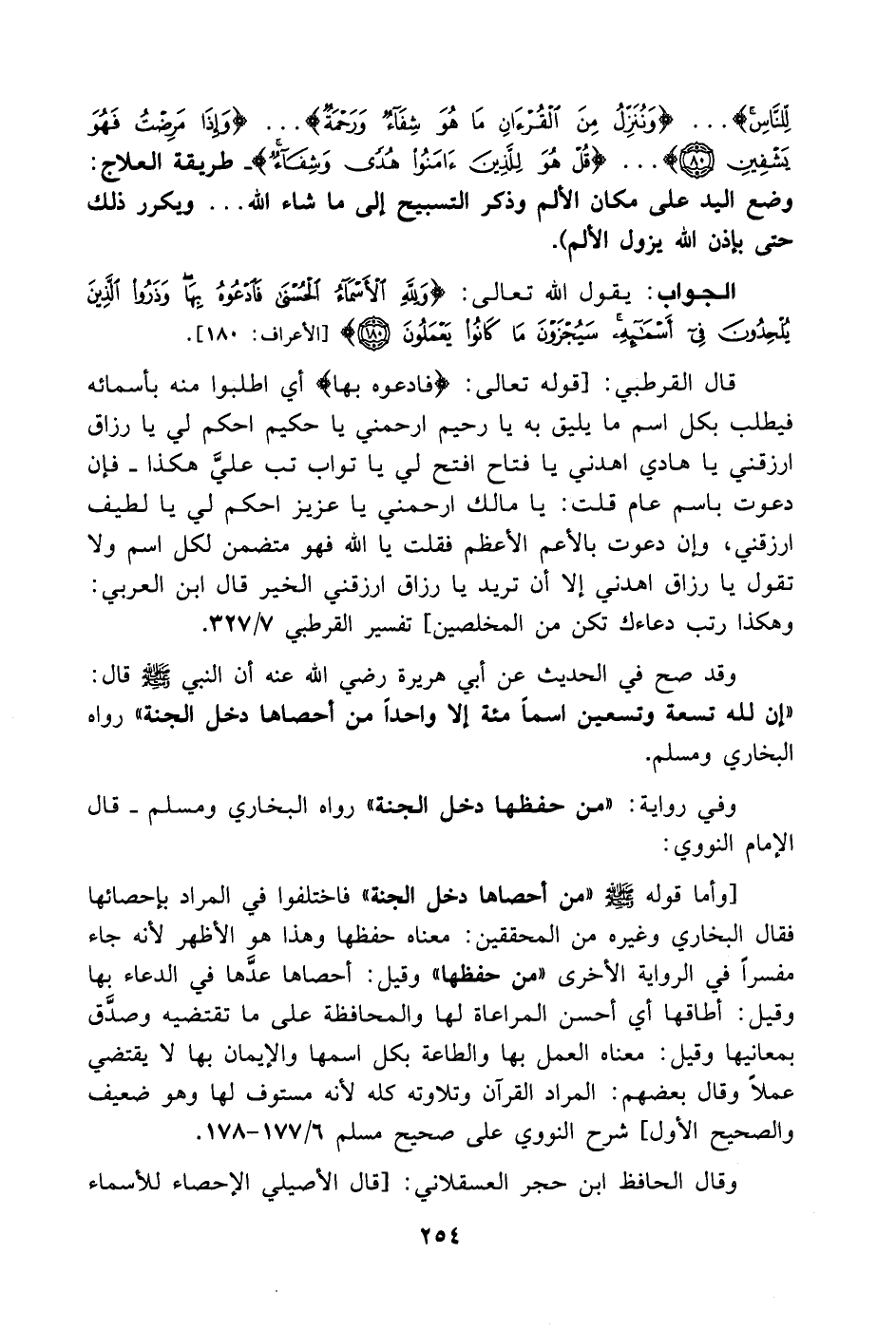 لِلنَّاسِ) .. (وَنُنَزِّلُ مِنَ الْقُرْءَانِ مَا هُوَ شِفَاءٌ وَرَحْمَةٌ) .. (وَإِذَا مَرِضْتُ فَهُوَ يَشْفِينِ) .. (قُلْ هُوَ لِلَّذِينَءَامَنُوا هُدًى وَشِفَاءٌ). طريقة العلاج: وضع اليد على مكان الألم وذكر التسبيح إلى ما شاء الله. ويكرر ذلك حتى بإذن الله يزول الألم).