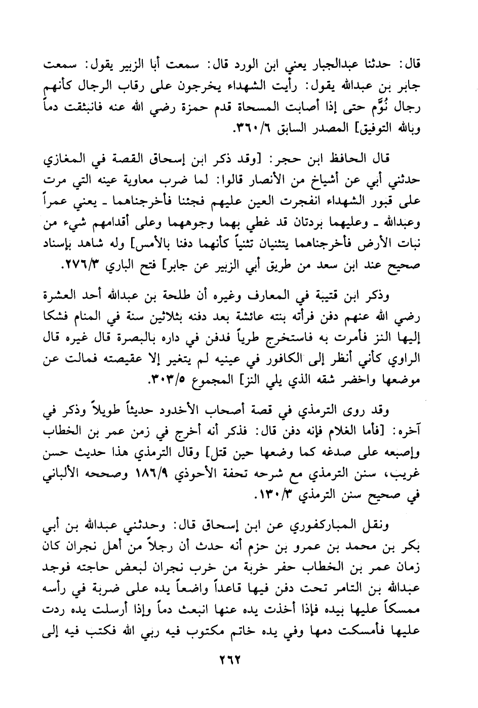 قال: حدثنا عبد الجبار يعني ابن الورد قال: سمعت أبا الزبير يقول: سمعت جابر بن عبد الله يقول: رأيت الشهداء يخرجون على رقاب الرجال كأنهم رجال نُوَّم حتى إذا أصابت المسحاة قدم حمزة - رضي الله عنه - فانبثقت دماً وبالله التوفيق] المصدر السابق 6/ 360.