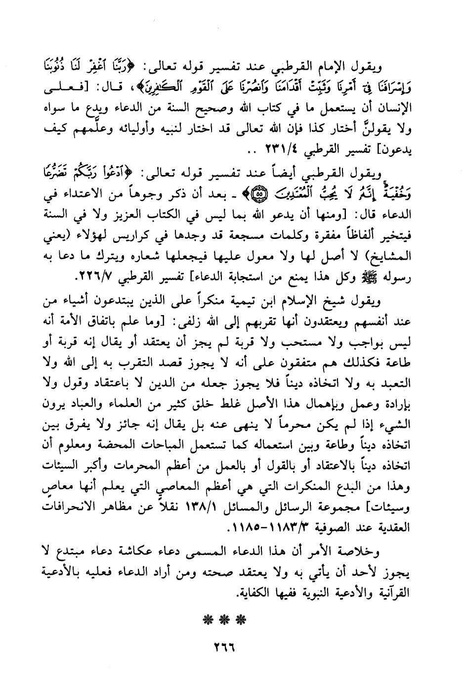 ويقول القرطبي أيضاً عند تفسير قوله تعالى: (ادْعُوا رَبَّكُمْ تَضَرُّعًا وَخُفْيَةً إِنَّهُ لَا يُحِبُّ الْمُعْتَدِينَ). بعد أن ذكر وجوهاً من الاعتداء في الدعاء قال: [ومنها أن يدعو الله بما ليس في الكتاب العزيز ولا في السنة فيتخير ألفاظاً مفقرة وكلمات مسجعة قد وجدها في كراريس لهؤلاء (يعني المشايخ) لا أصل لها ولا معول عليها فيجعلها شعاره ويترك ما دعا به رسوله - صَلَّى اللهُ عَلَيْهِ وَسَلَّمَ - وكل هذا يمنع من استجابة الدعاء] تفسير القرطبي 7/ 226.