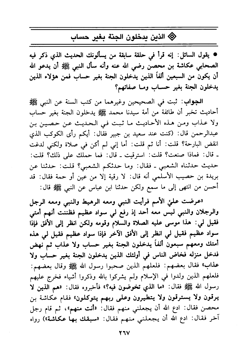 الجواب: ثبت في الصحيحين وغيرهما من كتب السنة عن النبي - صَلَّى اللهُ عَلَيْهِ وَسَلَّمَ - أحاديث تخبر أن طائفة من أمة سيدنا محمد - صَلَّى اللهُ عَلَيْهِ وَسَلَّمَ - يدخلون الجنة بغير حساب ولا عذاب ومن هذه الأحاديث ما ثبت في الحديث عن حصين بن عبد الرحمن قال: (كنت عند سعيد بن جبير فقال: أيكم رأى الكوكب الذي انقض البارحة؟ قلت: أنا ثم قلت: أما إني لم أكن في صلاة ولكني لدغت. قال: فماذا صنعت؟ قلت: استرقيت. قال: فما حملك على ذلك؟ قلت: حديث حدثناه الشعبي. فقال: وما حدثكم الشعبي؟ قلت: حدثنا عن بريدة بن حصيب الأسلمي أنه قال: لا رقية إلا من عين أو حمة فقال: قد أحسن من انتهى إلى ما سمع ولكن حدثنا ابن عباس عن النبي- صَلَّى اللهُ عَلَيْهِ وَسَلَّمَ - قال: