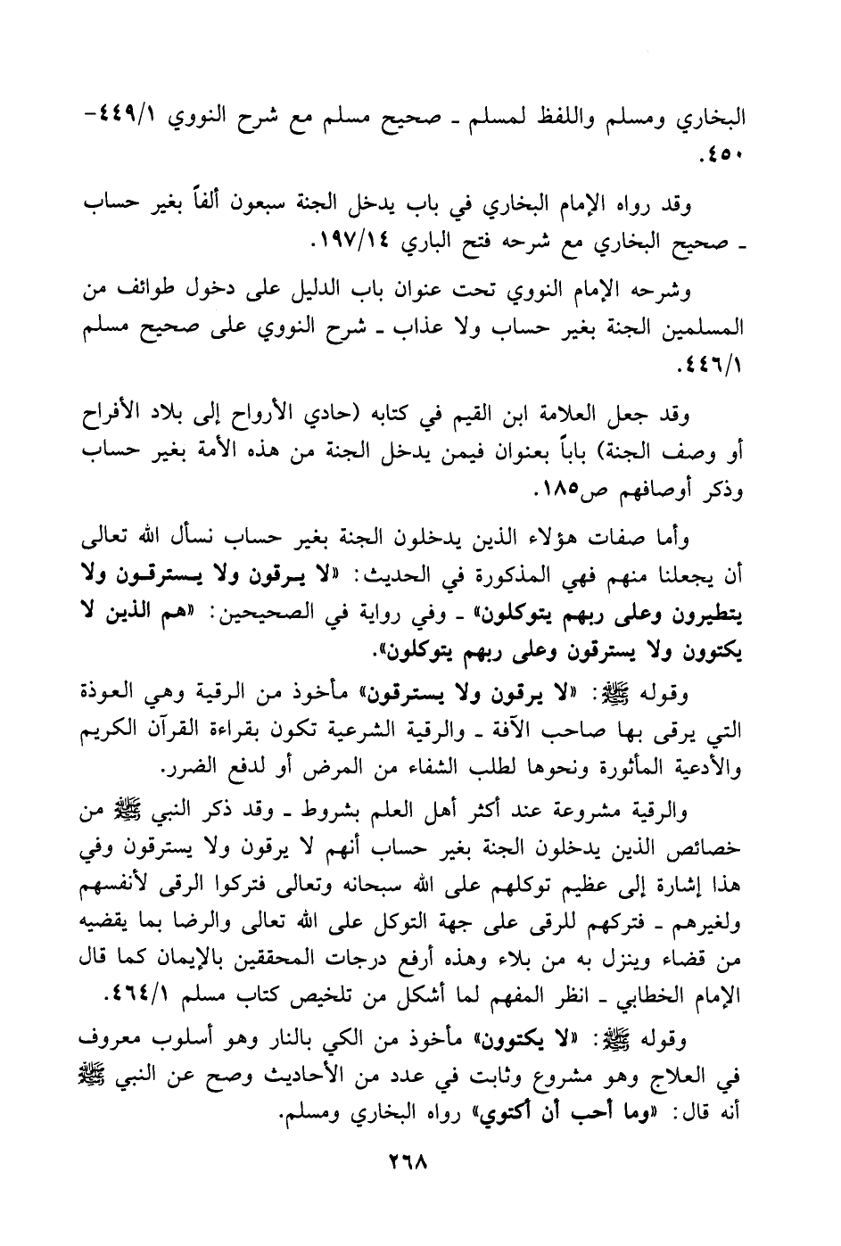 وقد جعل العلامة ابن القيم في كتابه (حادي الأرواح إلى بلاد الأفراح أو وصف الجنة) باباً بعنوان فيمن يدخل الجنة من هذه الأمة بغير حساب وذكر أوصافهم ص185.