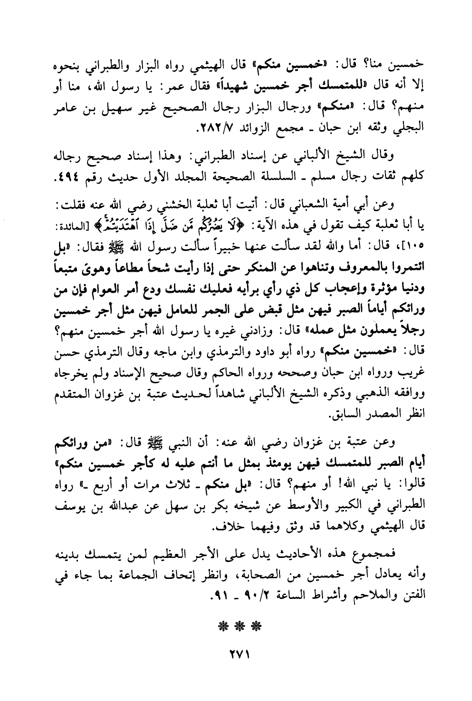وعن عتبة بن غزوان - رضي الله عنه -: أن النبي - صَلَّى اللهُ عَلَيْهِ وَسَلَّمَ - قال: (من ورائكم أيام الصبر للمتمسك فيهن يومئذ بمثل ما أنتم عليه له كأجر خمسين منكم قالوا: يا نبي الله! أو منهم؟ قال: بل منكم - ثلاث مرات أو أربع -) رواه الطبراني في الكبير والأوسط عن شيخه بكر بن سهل عن عبد الله بن يوسف قال الهيثمي وكلاهما قد وثق وفيهما خلاف.