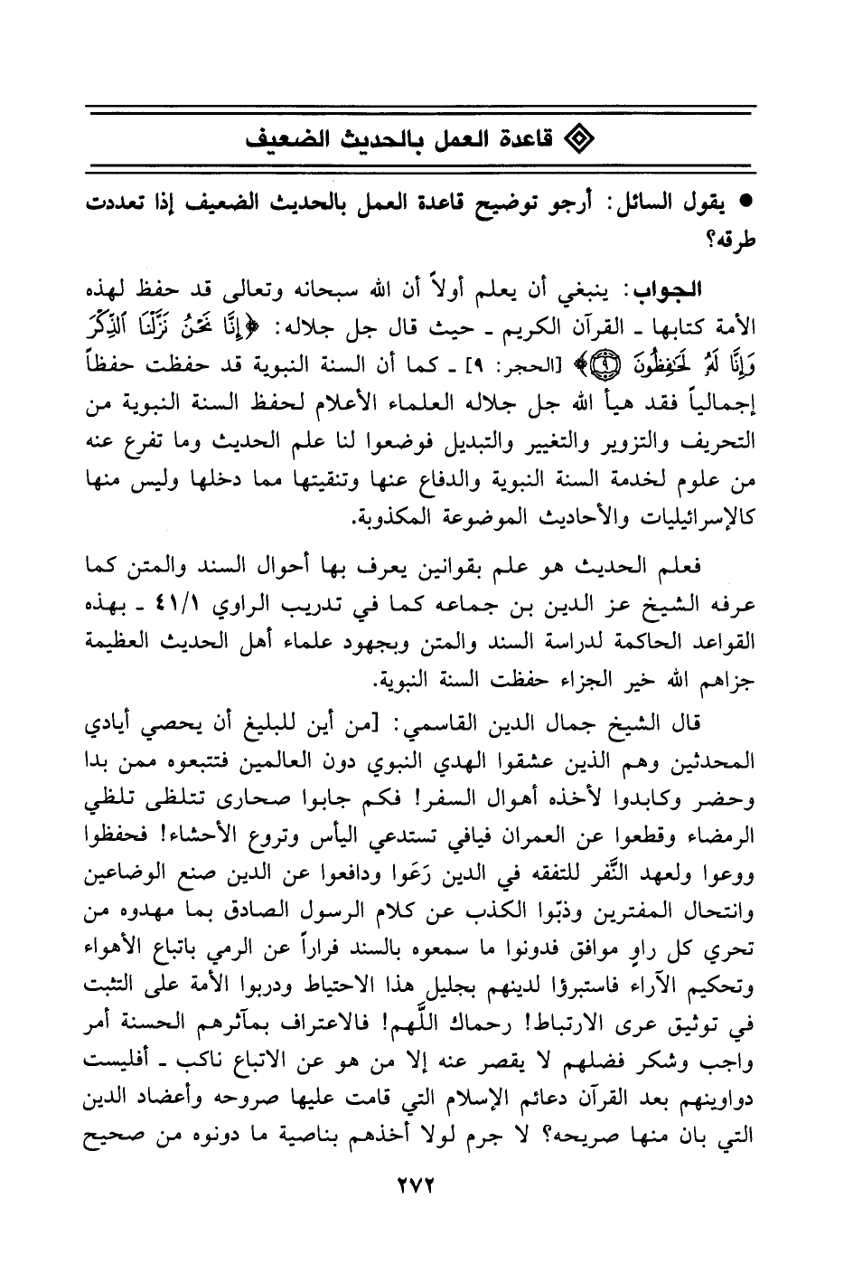 يقول السائل: أرجو توضيح قاعدة العمل بالحديث الضعيف إذا تعددت طرقه؟