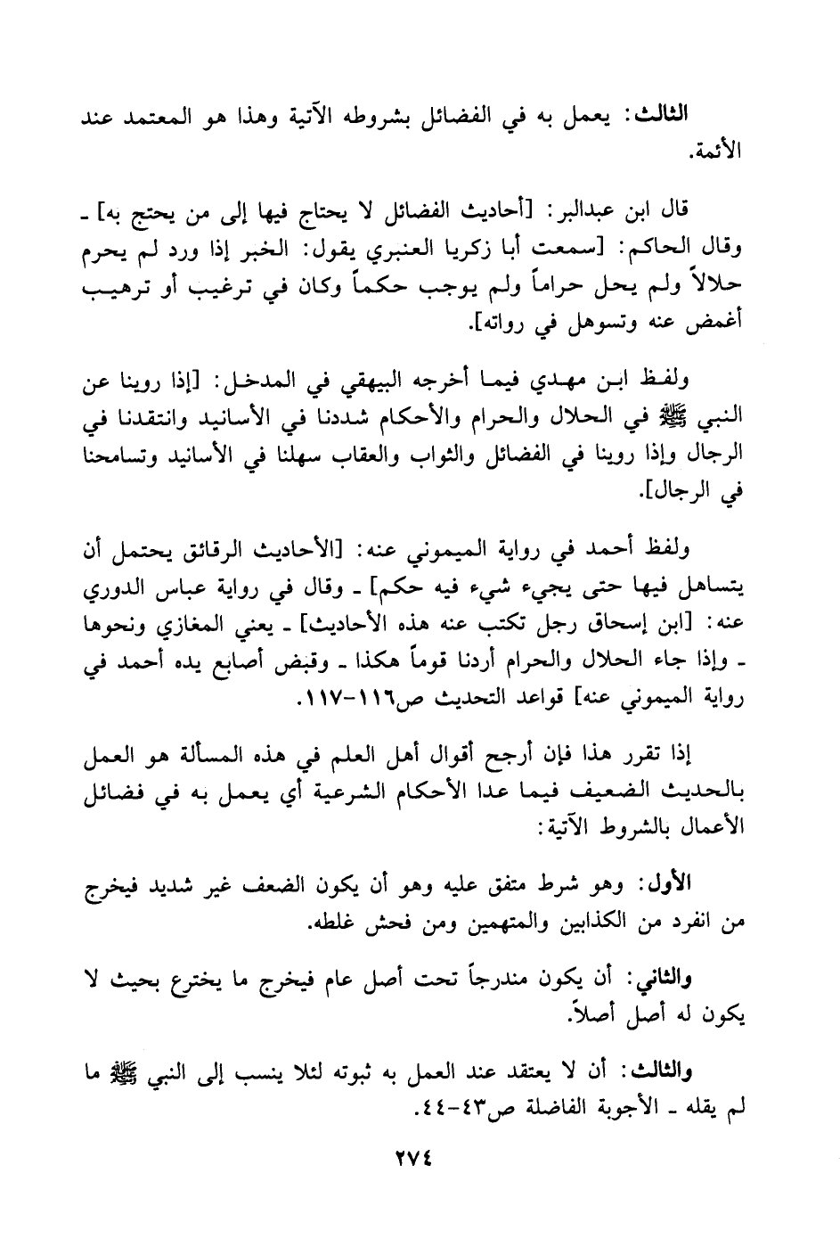 الثالث: يعمل به في الفضائل بشروطه الآتية وهذا هو المعتمد عند الأئمة.