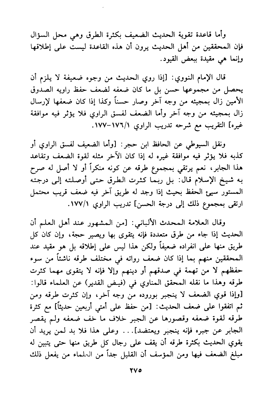 وقال العلامة المحدث الألباني: [من المشهور عند أهل العلم أن الحديث إذا جاء من طرق متعددة فإنه يتقوى بها ويصير حجة وإن كان كل طريق منها على إنفراده ضعيفاً ولكن هذا ليس على إطلاقه بل هو مقيد عند المحققين منهم بما إذا كان ضعف رواته في مختلف طرقه ناشئاً من سوء حفظهم لا من تهمة في صدقهم أو دينهم وإلا فإنه لا يتقوى مهما كثرت طرقه وهذا ما نقله المحقق المناوي في (فيض القدير) عن العلماء قالوا: [وإذا قوي الضعف لا ينجبر بوروده من وجه آخر وإن كثرت طرقه ومن ثم اتفقوا على ضعف الحديث: [من حفظ على أمتي أربعين حديثاً] مع كثرة طرقه لقوة ضعفه وقصورها عن الجبر خلاف ما خف ضعفه ولم يقصر الجابر عن جبره فإنه ينجبر ويعتضد] ... وعلى هذا فلا بد لمن يريد أن يقوي الحديث بكثرة طرقه أن يقف على رجال كل طريق منها حتى يتبين له مبلغ الضعف فيها ومن المؤسف أن القليل جداً من العلماء من يفعل ذلك