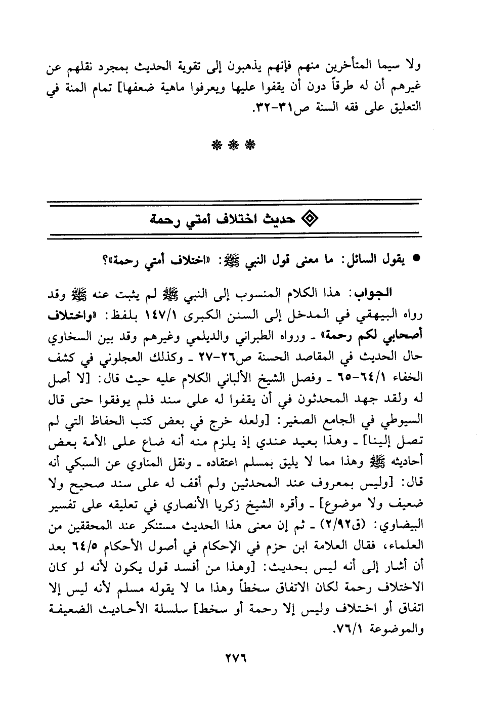 الجواب: هذا الكلام المنسوب إلى النبي - صَلَّى اللهُ عَلَيْهِ وَسَلَّمَ - لم يثبت عنه صَلَّى اللهُ عَلَيْهِ وَسَلَّمَ وقد رواه البيهقي في المدخل إلى السنن الكبرى 1/ 147 بلفظ: [واختلاف أصحابي لكم رحمة]. ورواه الطبراني والديلمي وغيرهم وقد بين السخاوي حال الحديث في المقاصد الحسنة ص26 - 27. وكذلك العجلوني في كشف الخفاء 1/ 64 - 65. وفصل الشيخ الألباني الكلام عليه حيث قال: [لا أصل له ولقد جهد المحدثون في أن يقفوا له على سند فلم يوفقوا حتى قال السيوطي في الجامع الصغير: [ولعله خرج في بعض كتب الحفاظ التي لم تصل إلينا]. وهذا بعيد عندي إذ يلزم منه أنه ضاع على الأمة بعض أحاديثه - صَلَّى اللهُ عَلَيْهِ وَسَلَّمَ - وهذا مما لا يليق بمسلم اعتقاده. ونقل المناوي عن السبكي أنه قال: [وليس بمعروف عند المحدثين ولم أقف له على سند صحيح ولا ضعيف ولا موضوع]. وأقره الشيخ زكريا الأنصاري في تعليقه على تفسير البيضاوي (ق92/ 2).