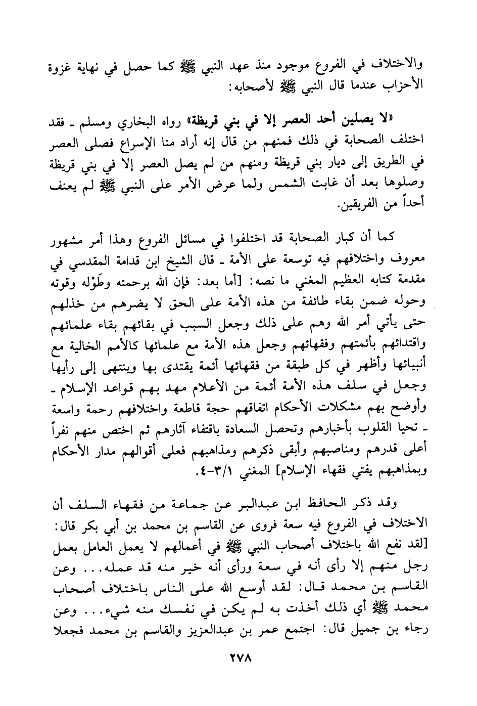 كما أن كبار الصحابة قد اختلفوا في مسائل الفروع وهذا أمر مشهور معروف واختلافهم فيه توسعة على الأمة. قال الشيخ ابن قدامة المقدسي في مقدمة كتابه العظيم المغني ما نصه: [أما بعد: فإن الله برحمته وطَوْله وقوته وحوله ضمن بقاء طائفة من هذه الأمة على الحق لا يضرهم من خذلهم حتى يأتي أمر الله وهم على ذلك وجعل السبب في بقائهم بقاء علمائهم واقتدائهم بأئمتهم وفقهائهم وجعل هذه الأمة مع علمائها كالأمم الخالية مع أنبيائها وأظهر في كل طبقة من فقهائها أئمة يقتدى بها وينتهى إلى رأيها وجعل في سلف هذه الأمة أئمة من الأعلام مهد بهم قواعد الإسلام. وأوضح بهم مشكلات الأحكام اتفاقهم حجة قاطعة واختلافهم رحمة واسعة. تحيا القلوب بأخبارهم وتحصل السعادة باقتفاء آثارهم ثم اختص منهم نفراً أعلى قدرهم ومناصبهم وأبقى ذكرهم ومذاهبهم فعلى أقوالهم مدار الأحكام وبمذاهبهم يفتي فقهاء الإسلام] المغني 1/ 3 - 4.