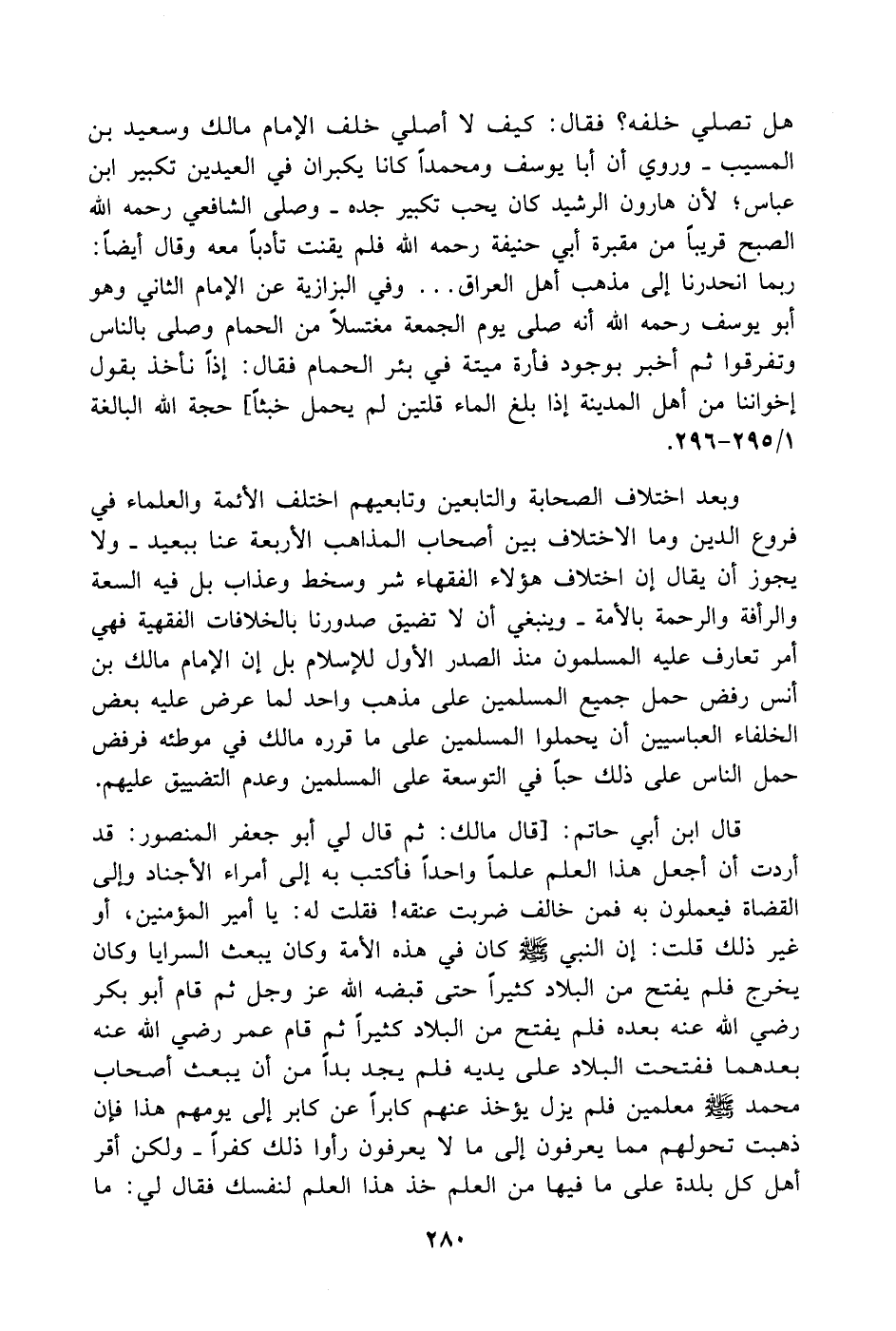 هل تصلي خلفه؟ فقال: كيف لا أصلي خلف الإمام مالك وسعيد بن المسيب. وروي أن أبا يوسف ومحمداً كانا يكبران في العيدين تكبير ابن عباس لأن هارون الرشيد كان يحب تكبير جده. وصلى الشافعي رحمه الله الصبح قريباً من مقبرة أبي حنيفة رحمه الله فلم يقنت تأدباً معه وقال أيضاً: ربما انحدرنا إلى مذهب أهل العراق. وفي البزازية عن الإمام الثاني وهو أبو يوسف رحمه الله أنه صلى يوم الجمعة مغتسلاً من الحمام وصلى بالناس وتفرقوا ثم أخبر بوجود فأرة ميتة في بئر الحمام فقال: إذاً نأخذ بقول إخواننا من أهل المدينة إذا بلغ الماء قلتين لم يحمل خبثاً] حجة الله البالغة 1/ 295 - 296.
