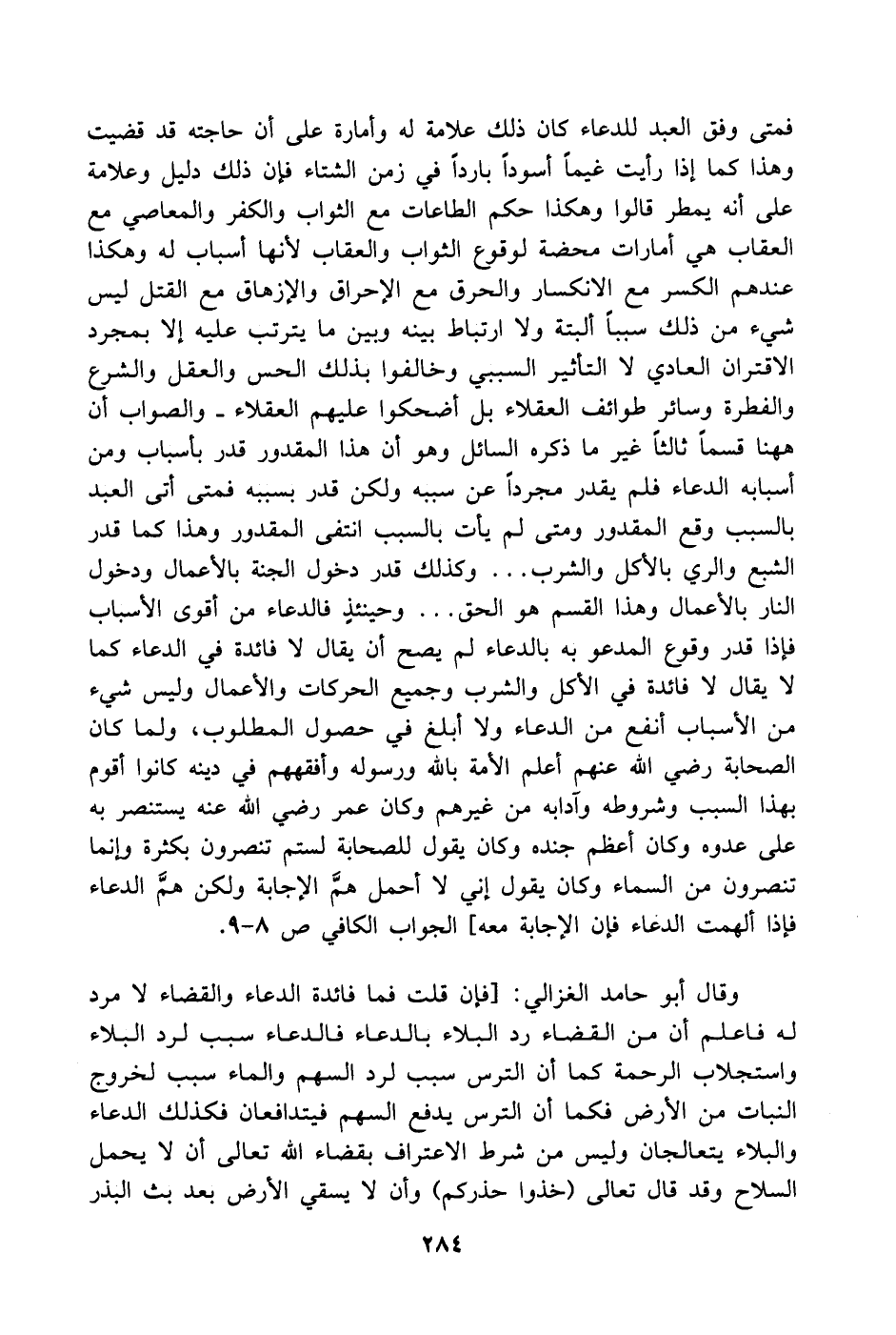 وقال أبو حامد الغزالي: [فإن قلت فما فائدة الدعاء والقضاء لا مرد له فاعلم أن من القضاء رد البلاء بالدعاء فالدعاء سبب لرد البلاء واستجلاب الرحمة كما أن الترس سبب لرد السهم والماء سبب لخروج النبات من الأرض فكما أن الترس يدفع السهم فيتدافعان فكذلك الدعاء والبلاء يتعالجان وليس من شرط الاعتراف بقضاء الله تعالى أن لا يحمل السلاح وقد قال تعالى (خذوا حذركم) وأن لا يسقي الارض بعد بث البذر