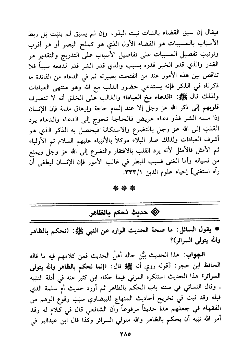 فيقال إن سبق القضاء بالنبات نبت البذر وإن لم يسبق لم ينبت بل ربط الأسباب بالمسببات هو القضاء الأول الذي هو كملح البصر أو هو أقرب وترتيب تفصيل المسببات على تفاصيل الأسباب على التدريج والتقدير هو القدر والذي قدر الخير قدره بسبب والذي قدر الشر قدر لدفعه سبباً فلا تناقص بين هذه الأمور عند من انفتحت بصيرته ثم في الدعاء من الفائدة ما ذكرناه في الذكر فإنه يستدعي حضور القلب مع الله وهو منتهى العبادات ولذلك قال - صَلَّى اللهُ عَلَيْهِ وَسَلَّمَ -: (الدعاء مخ العبادة) والغالب على الخلق أنه لا تنصرف قلوبهم إلى ذكر الله عز وجل إلا عند إلمام حاجة وإرهاق ملمة فإن الإنسان إذا مسه الشر فذو دعاء عريض فالحاجة تحوج إلى الدعاء والدعاء يرد القلب إلى الله عز وجل بالتضرع والاستكانة فيحصل به الذكر الذي هو أشرف العبادات ولذلك صار البلاء موكلاً بالأنبياء عليهم السلام ثم الأولياء ثم الأمثل فالأمثل لأنه يرد القلب بالإفتقار والتضرع إلى الله عز وجل ويمنع من نسيانه وأما الغنى فسبب للبطر في غالب الأمور فإن الإنسان ليطغى أن رآه استغنى] إحياء علوم الدين 1/ 333.