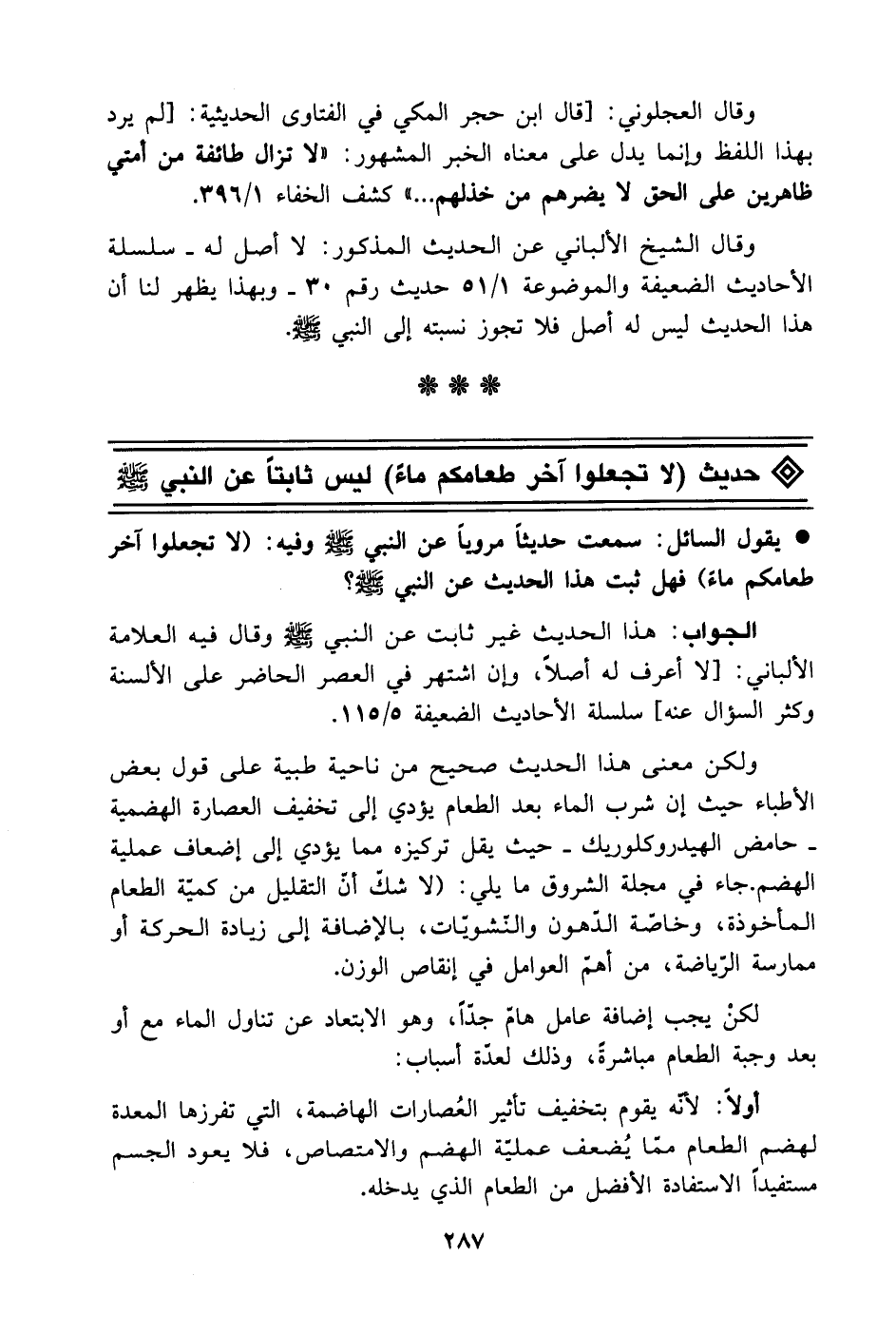 يقول السائل: سمعت حديثاً مروياً عن النبي - صَلَّى اللهُ عَلَيْهِ وَسَلَّمَ - وفيه: (لا تجعلوا آخر طعامكم ماءً) فهل ثبت هذا الحديث عن النبي - صَلَّى اللهُ عَلَيْهِ وَسَلَّمَ -؟