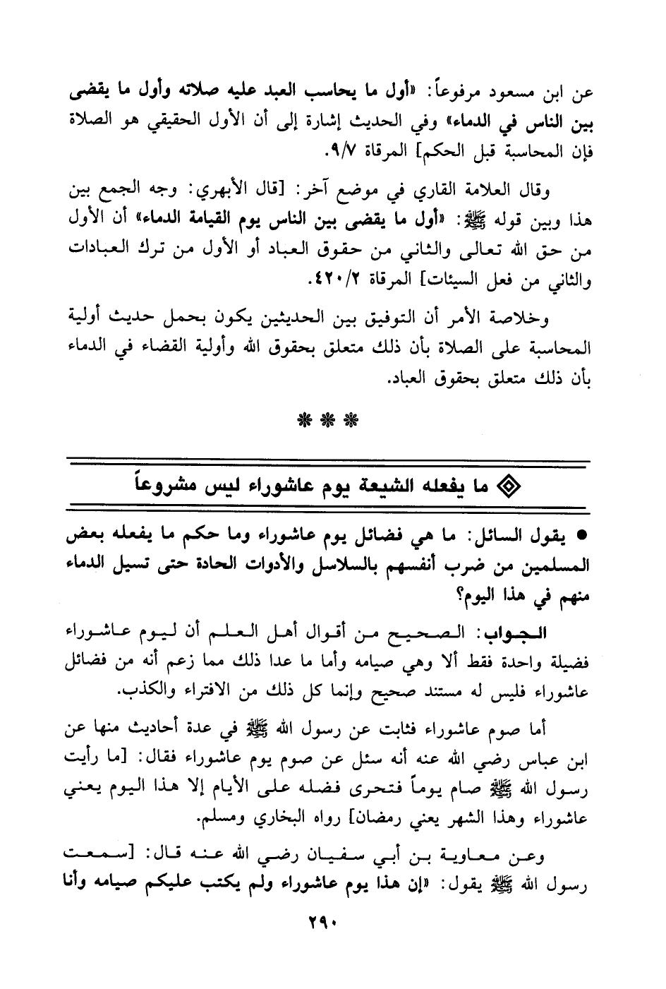 وقال العلامة القاري في موضع آخر: [قال الأبهري: وجه الجمع بين هذا وبين قوله - صَلَّى اللهُ عَلَيْهِ وَسَلَّمَ -: (أول ما يقضى بين الناس يوم القيامة الدماء) أن الأول من حق الله تعالى والثاني من حقوق العباد أو الأول من ترك العبادات والثاني من فعل السيئات] المرقاة 2/ 420