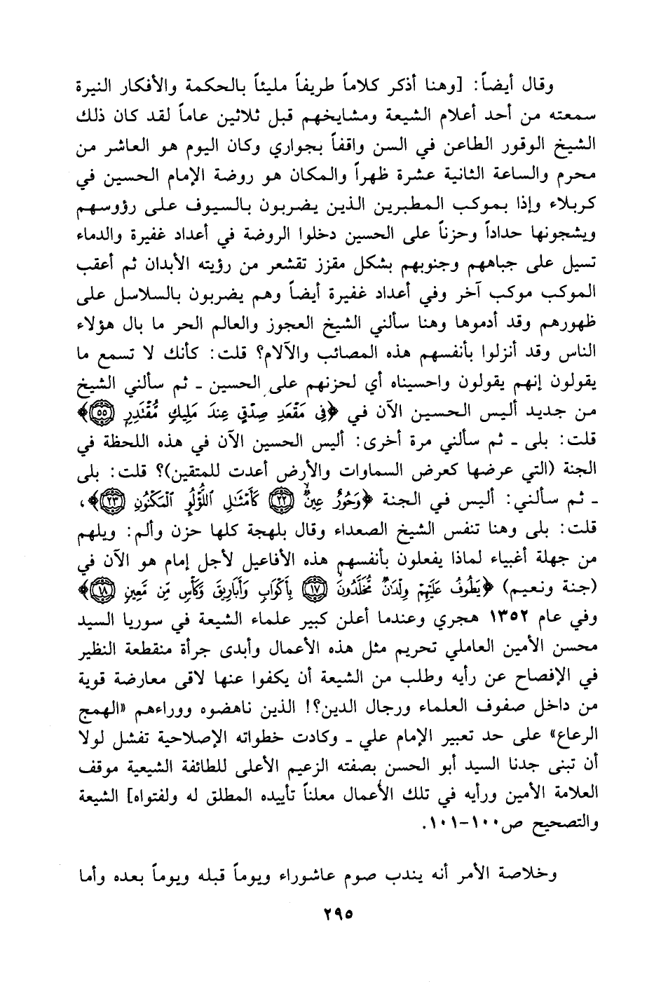 وقال أيضاً: [وهنا أذكر كلاماً طريفاً مليئاً بالحكمة والأفكار النيرة سمعته من أحد أعلام الشيعة ومشايخهم قبل ثلاثين عاماً لقد كان ذلك الشيخ الوقور الطاعن في السن واقفاً بجواري وكان اليوم هو العاشر من محرم والساعة الثانية عشرة ظهراً والمكان هو روضة الإمام الحسين في كربلاء وإذا بموكب المطبرين الذين يضربون بالسيوف على رؤوسهم ويشجونها حداداً وحزناً على الحسين دخلوا الروضة في أعداد غفيرة والدماء تسيل على جباههم وجنوبهم بشكل مقزز تقشعر من رؤيته الأبدان ثم أعقب الموكب موكب آخر وفي أعداد غفيرة أيضاً وهم يضربون بالسلاسل على ظهورهم وقد أدموها وهنا سألني الشيخ العجوز والعالم الحر ما بال هؤلاء الناس وقد أنزلوا بأنفسهم هذه المصائب والآلام؟ قلت: كأنك لا تسمع ما يقولون إنهم يقولون واحسيناه أي لحزنهم على الحسين. ثم سألني الشيخ من جديد أليس الحسين الآن في (فِي مَقْعَدِ صِدْقٍ عِنْدَ مَلِيكٍ مُقْتَدِرٍ) قلت: بلى. ثم سألني مرة أخرى: أليس الحسين الآن في هذه اللحظة في الجنة (التي عرضها كعرض السماوات والأرض أعدت للمتقين)؟ قلت: بلى. ثم سألني: أليس في الجنة (حور عين كأمثال اللؤلؤ المكنون)، قلت: بلى وهنا تنفس الشيخ الصعداء وقال بلهجة كلها حزن وألم: ويلهم من جهلة أغبياء لماذا يفعلون بأنفسهم هذه الأفاعيل لأجل إمام هو الآن في (جنة ونعيم) ويطوف عليه ولدان مخلدون بأكواب وأباريق وكأس من معين). وفي عام 1352 هجري وعندما أعلن كبير علماء الشيعة في سوريا السيد محسن الأمين العاملي تحريم مثل هذه الأعمال وأبدى جرأة منقطعة النظير في الإفصاح عن رأيه وطلب من الشيعة أن يكفوا عنها لاقى معارضة قوية من داخل صفوف العلماء ورجال الدين؟! الذين ناهضوه وورائهم " الهمج الرعاع " على حد تعبير الإمام علي. وكادت خطواته الإصلاحية تفشل لولا أن تبنى جدنا السيد أبو الحسن بصفته الزعيم الأعلى للطائفة الشيعية موقف العلامة الأمين ورأيه في تلك الأعمال معلناً تأييده المطلق له ولفتواه] الشيعة والتصحيح ص100 - 101.