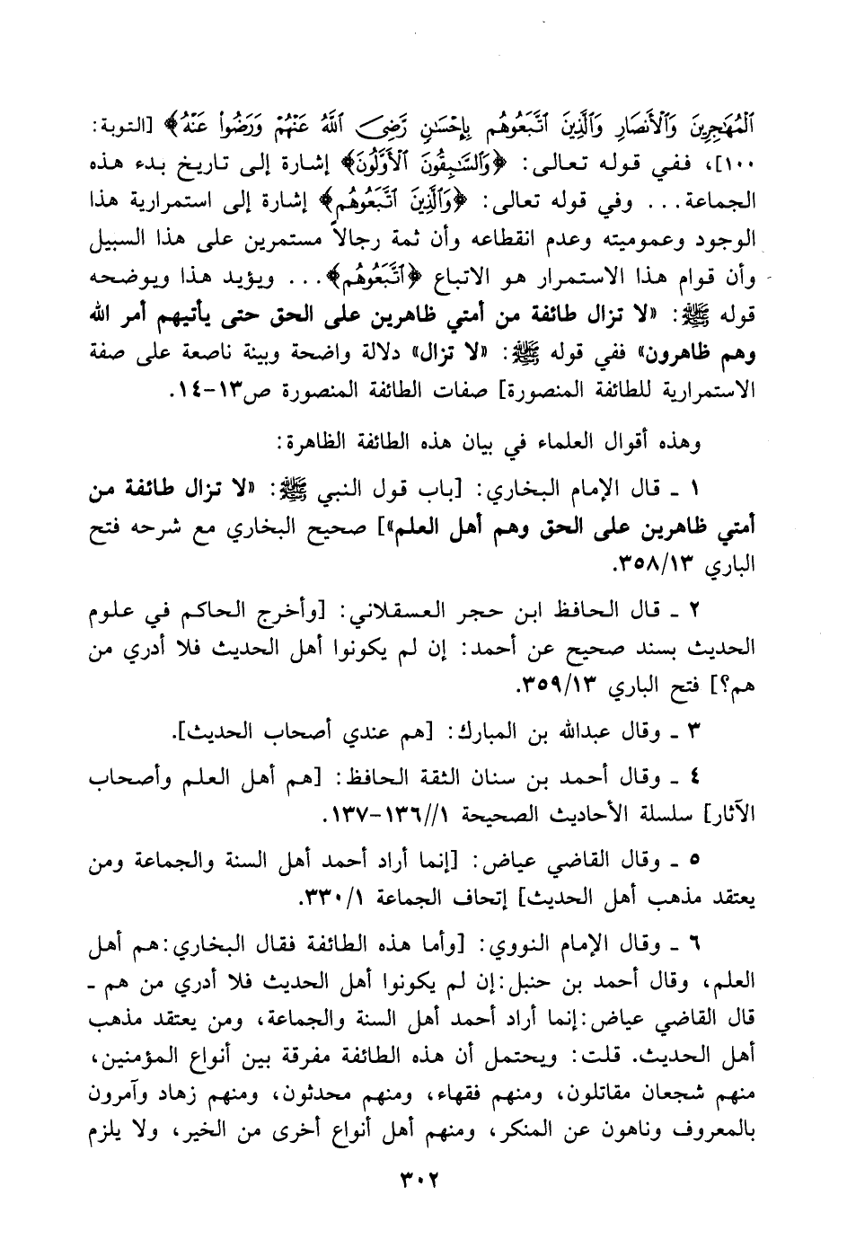 الْمُهَاجِرِينَ وَالْأَنْصَارِ وَالَّذِينَ اتَّبَعُوهُمْ بِإِحْسَانٍ رَضِيَ اللَّهُ عَنْهُمْ وَرَضُوا عَنْهُ) سورة التوبة الآية 100، ففي قوله تعالى: (السَّابِقُونَ الْأَوَّلُونَ) إشارة إلى تاريخ بدء هذه الجماعة ... وفي قوله تعالى: (وَالَّذِينَ اتَّبَعُوهُمْ) إشارة إلى استمرارية هذا الوجود وعموميته وعدم انقطاعه وأن ثمة رجالاً مستمرين على هذا السبيل وأن قوام هذا الاستمرار هو الاتباع (اتَّبَعُوهُمْ) ... ويؤيد هذا ويوضحه قوله - صَلَّى اللهُ عَلَيْهِ وَسَلَّمَ -: (لا تزال طائفة من أمتي ظاهرين على الحق حتى يأتيهم أمر الله وهم ظاهرون) ففي قوله - صَلَّى اللهُ عَلَيْهِ وَسَلَّمَ -: (لا تزال) دلالة واضحة وبينة ناصعة على صفة الاستمرارية للطائفة المنصورة] صفات الطائفة المنصورة ص13 - 14.