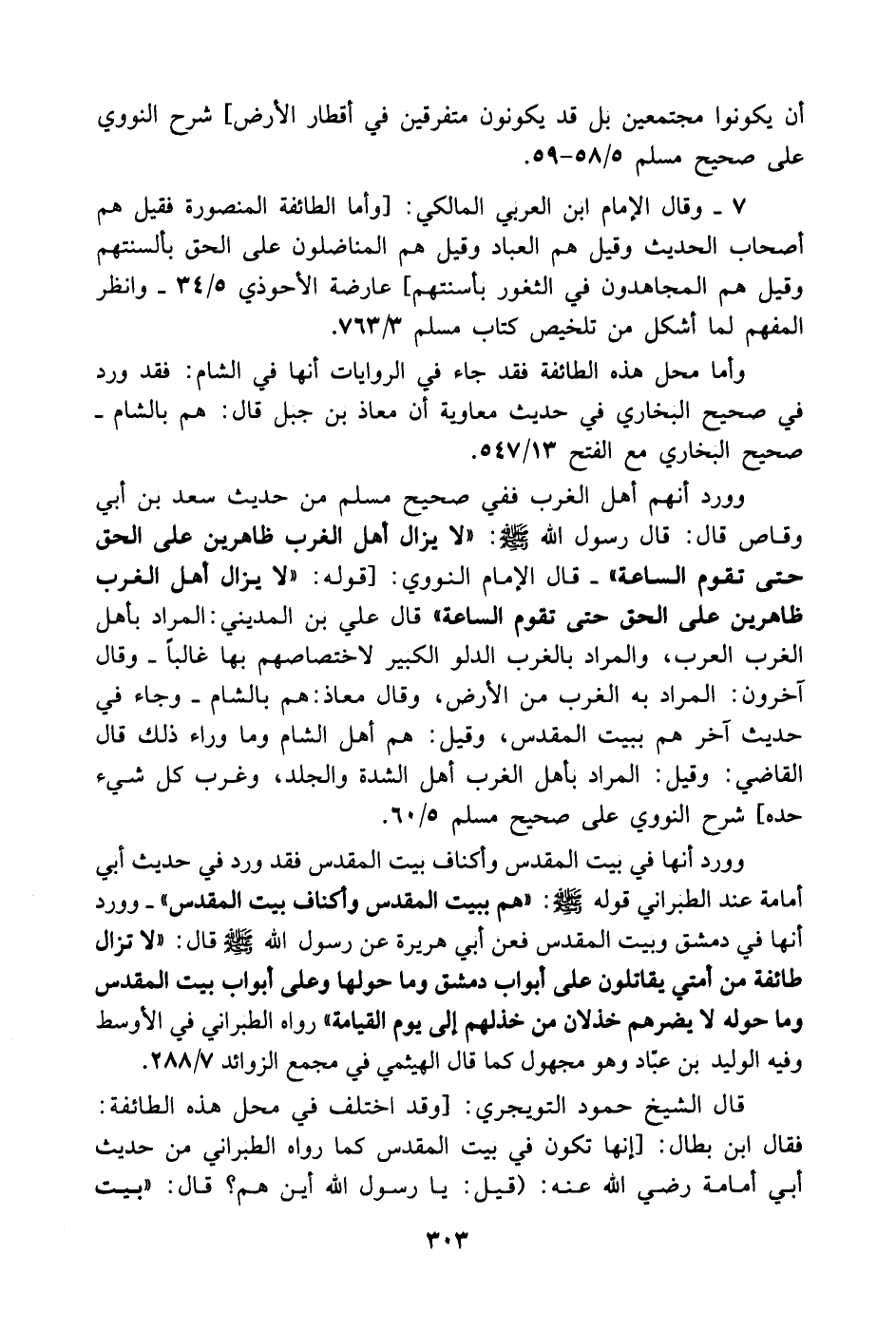 7. وقال الإمام ابن العربي المالكي: [وأما الطائفة المنصورة فقيل هم أصحاب الحديث وقيل هم العباد وقيل هم المناضلون على الحق بألسنتهم وقيل هم المجاهدون في الثغور بأسنتهم] عارضة الأحوذي 5/ 34. وانظر المفهم لما أشكل من تلخيص كتاب مسلم 3/ 763.