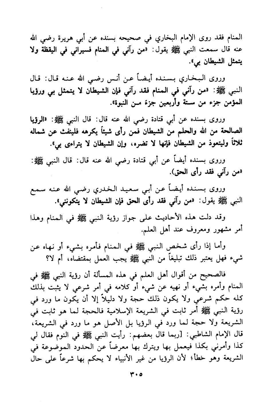 وروى بسنده أيضاً عن أبي سعيد الخدري - رضي الله عنه - سمع النبي - صَلَّى اللهُ عَلَيْهِ وَسَلَّمَ - يقول: (من رآني فقد رأى الحق فإن الشيطان لا يتكونني).