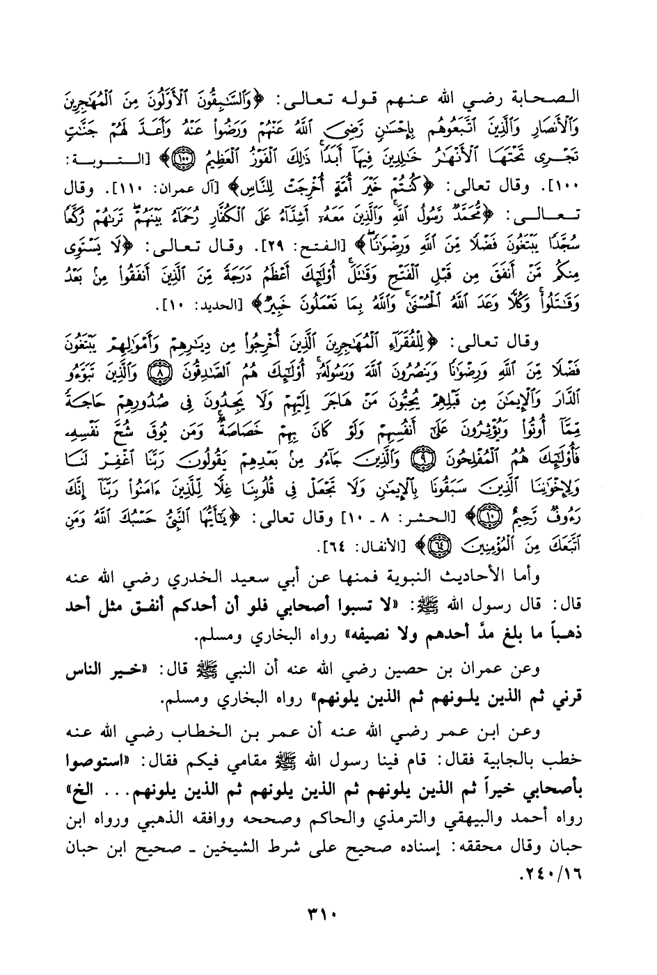 الصحابة رضي الله عنهم قوله تعالى: (وَالسَّابِقُونَ الْأَوَّلُونَ مِنَ الْمُهَاجِرِينَ وَالْأَنْصَارِ وَالَّذِينَ اتَّبَعُوهُمْ بِإِحْسَانٍ رَضِيَ اللَّهُ عَنْهُمْ وَرَضُوا عَنْهُ وَأَعَدَّ لَهُمْ جَنَّاتٍ تَجْرِي تَحْتَهَا الْأَنْهَارُ خَالِدِينَ فِيهَا أَبَدًا ذَلِكَ الْفَوْزُ الْعَظِيمُ) سورة التوبة الآية 100. وقال تعالى: (كُنْتُمْ خَيْرَ أُمَّةٍ أُخْرِجَتْ لِلنَّاسِ) سورة آل عمران الآية 110. وقال تعالى: (مُحَمَّدٌ رَسُولُ اللَّهِ وَالَّذِينَ مَعَهُ أَشِدَّاءُ عَلَى الْكُفَّارِ رُحَمَاءُ بَيْنَهُمْ تَرَاهُمْ رُكَّعًا سُجَّدًا يَبْتَغُونَ فَضْلًا مِنَ اللَّهِ وَرِضْوَانًا) سورة الفتح الآية 29. وقال تعالى: (لا يَسْتَوِي مِنْكُمْ مَنْ أَنْفَقَ مِنْ قَبْلِ الْفَتْحِ وَقَاتَلَ أُولَئِكَ أَعْظَمُ دَرَجَةً مِنَ الَّذِينَ أَنْفَقُوا مِنْ بَعْدُ وَقَاتَلُوا وَكُلًّا وَعَدَ اللَّهُ الْحُسْنَى وَاللَّهُ بِمَا تَعْمَلُونَ خَبِيرٌ) سورة الحديد الآية 10.