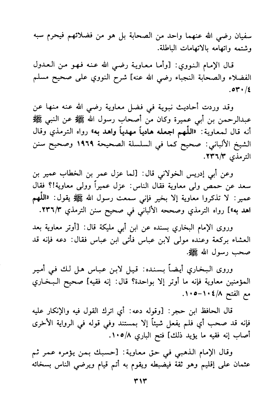 قال الإمام النووي: [وأما معاوية - رضي الله عنه - فهو من العدول الفضلاء والصحابة النجباء - رضي الله عنه -] شرح النووي على صحيح مسلم 4/ 530.