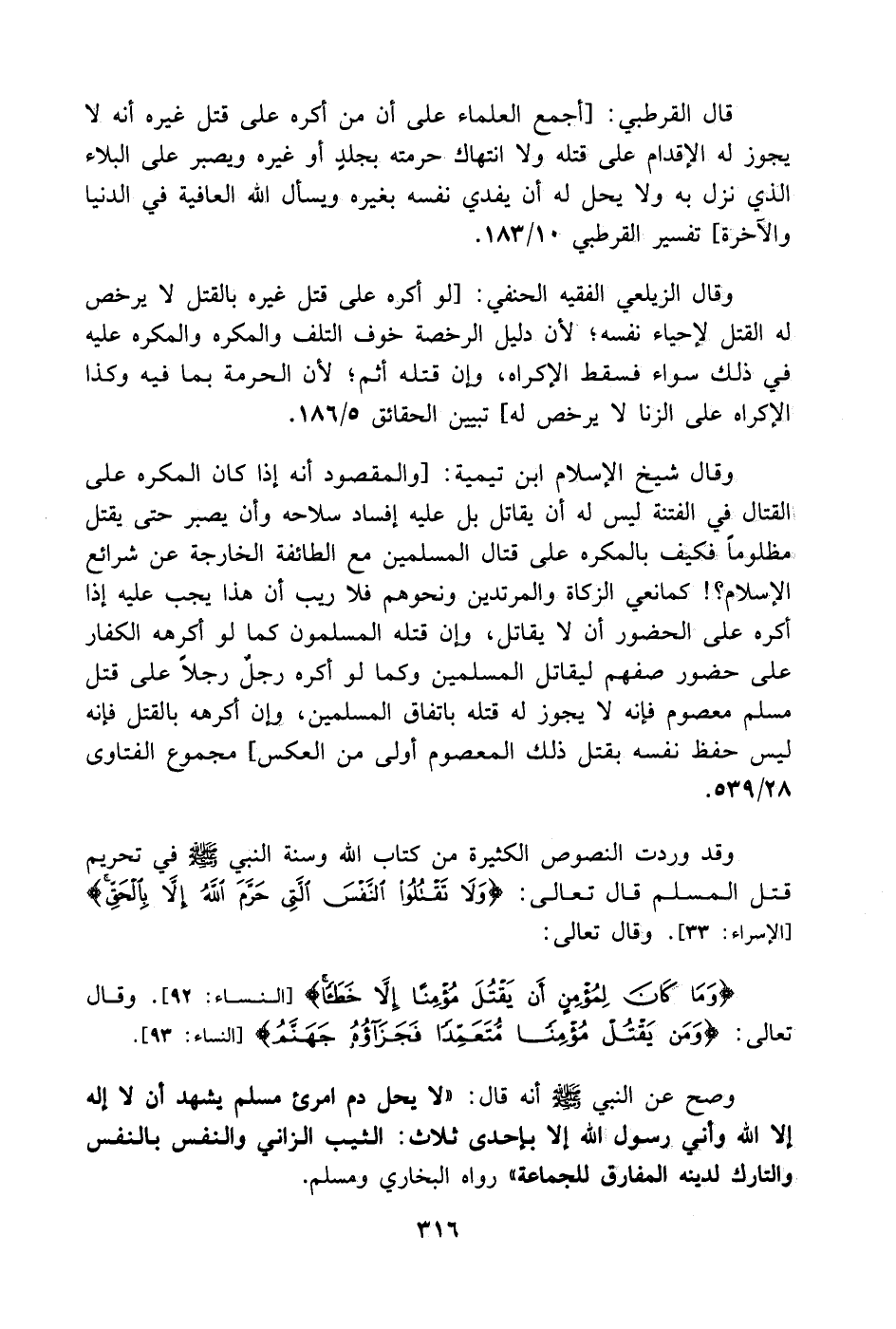 وقال شيخ الإسلام ابن تيمية: [والمقصود أنه إذا كان المكره على القتال في الفتنة ليس له أن يقاتل بل عليه إفساد سلاحه وأن يصبر حتى يقتل مظلوماً فكيف بالمكره على قتال المسلمين مع الطائفة الخارجة عن شرائع الإسلام؟! كمانعي الزكاة والمرتدين ونحوهم فلا ريب أن هذا يجب عليه إذا أكره على الحضور أن لا يقاتل وإن قتله المسلمون كما لو أكرهه الكفار على حضور صفهم ليقاتل المسلمين وكما لو أكره رجلٌ رجلاً على قتل مسلم معصوم فإنه لا يجوز له قتله باتفاق المسلمين وإن أكرهه بالقتل فإنه ليس حفظ نفسه بقتل ذلك المعصوم أولى من العكس] مجموع الفتاوى 28/ 539.