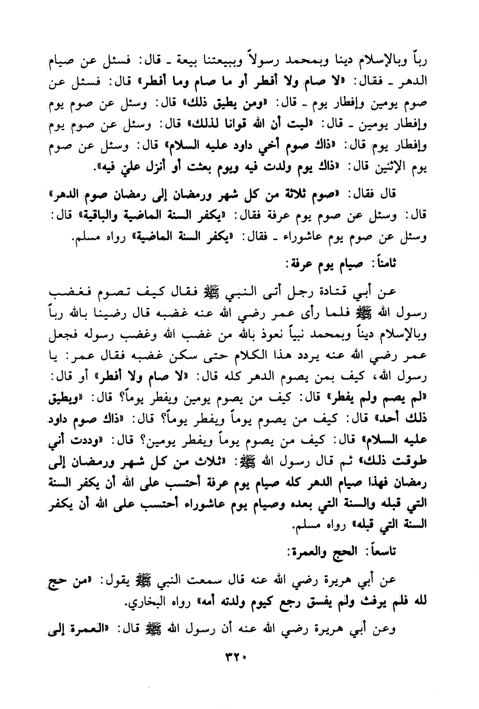 ربا وبالإسلام دينا وبمحمد رسولا وببيعتنا بيعة. قال: فسئل عن صيام الدهر. فقال: لا صام ولا أفطر أو ما صام وما أفطر. قال: فسئل عن صوم يومين وإفطار يوم. قال: ومن يطيق ذلك قال وسئل عن صوم يوم وإفطار يومين. قال: ليت أن الله قوانا لذلك. قال: وسئل عن صوم يوم وإفطار يوم. قال: ذاك صوم أخي داود عليه السلام. قال: وسئل عن صوم يوم الإثنين قال: ذاك يوم ولدت فيه ويوم بعثت أو أنزل علي فيه.