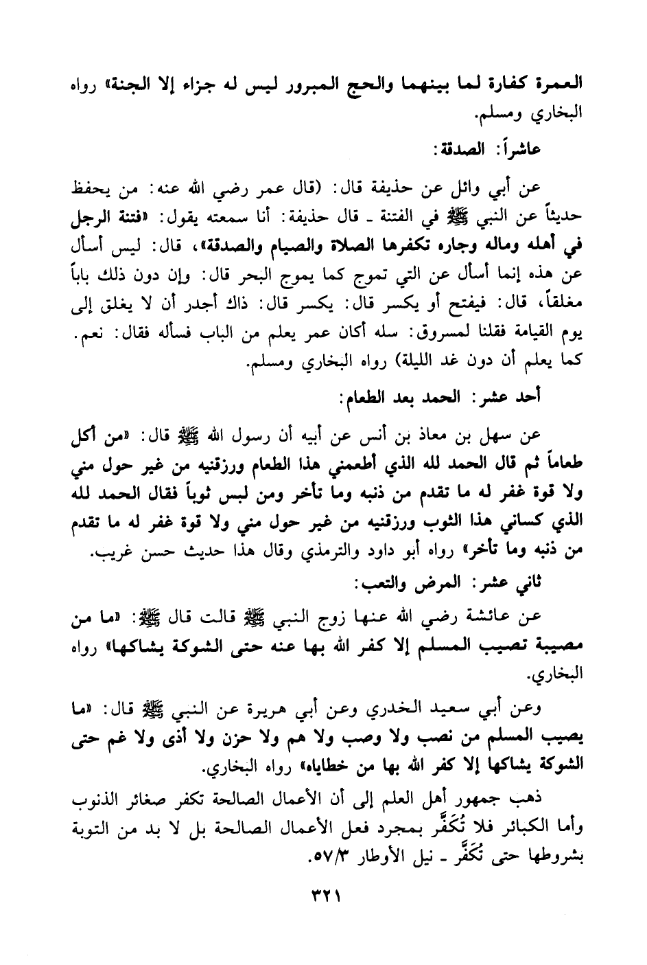 وعن أبي سعيد الخدري وعن أبي هريرة عن النبي - صَلَّى اللهُ عَلَيْهِ وَسَلَّمَ - قال: (ما يصيب المسلم من نصب ولا وصب ولا هم ولا حزن ولا أذى ولا غم حتى الشوكة يشاكها إلا كفر الله بها من خطاياه) رواه البخاري.