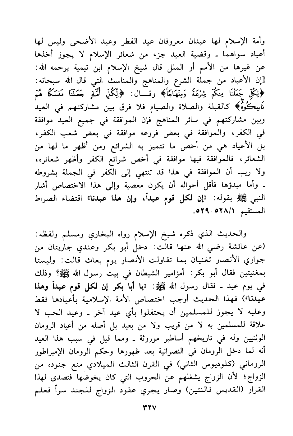 والحديث الذي ذكره شيخ الإسلام رواه البخاري ومسلم ولفظه: (عن عائشة رضي الله عنها قالت: دخل أبو بكر وعندي جاريتان من جواري الأنصار تغنيان بما تقاولت الأنصار يوم بعاث قالت: وليستا بمغنيتين فقال أبو بكر: أمزامير الشيطان في بيت رسول الله - صَلَّى اللهُ عَلَيْهِ وَسَلَّمَ -؟ وذلك في يوم عيد. فقال رسول الله - صَلَّى اللهُ عَلَيْهِ وَسَلَّمَ -: يا أبا بكر إن لكل قوم عيداً وهذا عيدنا) فهذا الحديث أوجب اختصاص الأمة الإسلامية بأعيادها فقط وعليه لا يجوز للمسلمين أن يحتفلوا بأي عيد آخر. وعيد الحب لا علاقة للمسلمين به لا من قريب ولا من بعيد بل أصله من أعياد الرومان الوثنيين وله في تاريخهم أساطير موروثة. ومما قيل في سبب هذا العيد أنه لما دخل الرومان في النصرانية بعد ظهورها وحكم الرومان الإمبراطور الروماني (كلوديوس الثاني) في القرن الثالث الميلادي منع جنوده من الزواج لأن الزواج يشغلهم عن الحروب التي كان يخوضها فتصدى لهذا القرار (القديس فالنتين) وصار يجري عقود الزواج للجند سراً فعلم