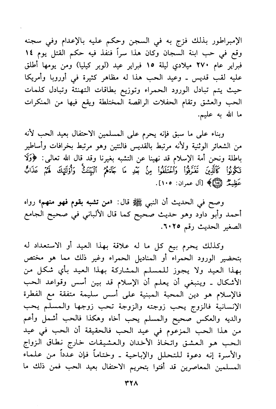 وبناء على ما سبق فإنه يحرم على المسلمين الاحتفال بعيد الحب لأنه من الشعائر الوثنية ولأنه مرتبط بالقديس فالنتين وهو مرتبط بخرافات وأساطير باطلة ونحن أمة الإسلام قد نهينا عن التشبه بغيرنا وقد قال الله تعالى: (ولا تَكُونُوا كَالَّذِينَ تَفَرَّقُوا وَاخْتَلَفُوا مِنْ بَعْدِ مَا جَاءَهُمُ الْبَيِّنَاتُ وَأُولَئِكَ لَهُمْ عَذَابٌ عَظِيمٌ) سورة آل عمران الآية 105.