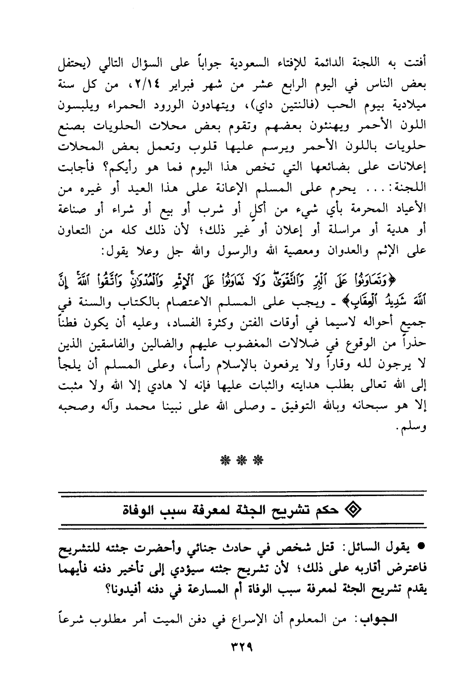 أفتت به اللجنة الدائمة للإفتاء السعودية جواباً على السؤال التالي (يحتفل بعض الناس في اليوم الرابع عشر من شهر فبراير 14/ 2، من كل سنة ميلادية بيوم الحب (فالنتين داي)، ويتهادون الورود الحمراء ويلبسون اللون الأحمر ويهنئون بعضهم وتقوم بعض محلات الحلويات بصنع حلويات باللون الأحمر ويرسم عليها قلوب وتعمل بعض المحلات إعلانات على بضائعها التي تخص هذا اليوم فما هو رأيكم؟ فأجابت اللجنة:. يحرم على المسلم الإعانة على هذا العيد أو غيره من الأعياد المحرمة بأي شيء من أكلٍ أو شرب أو بيع أو شراء أو صناعة أو هدية أو مراسلة أو إعلان أو غير ذلك لأن ذلك كله من التعاون على الإثم والعدوان ومعصية الله والرسول والله جل وعلا يقول: