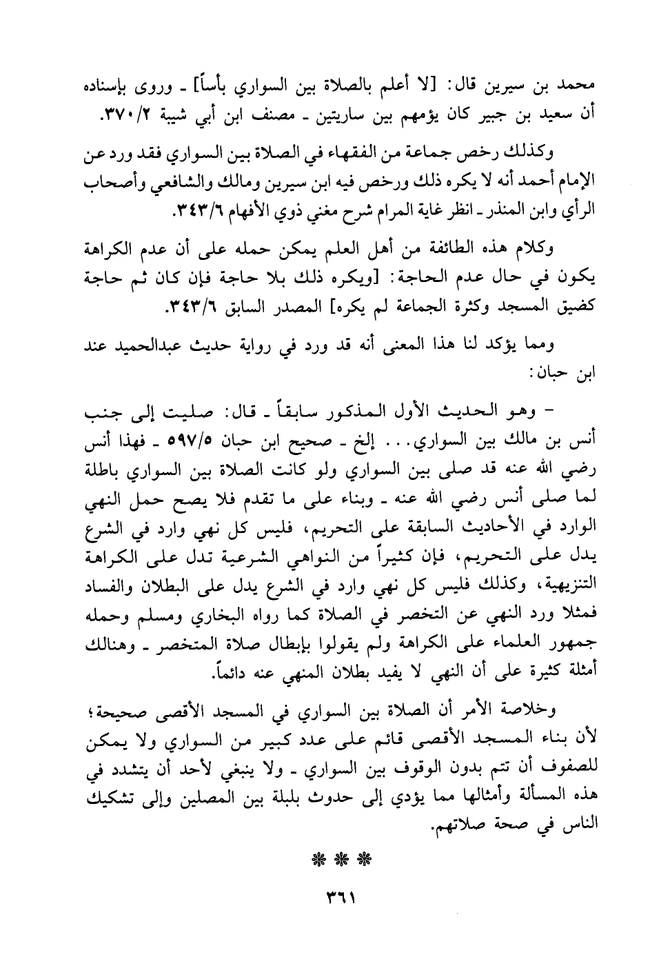 - وهو الحديث الأول المذكور سابقاً - قال: صليت إلى جنب أنس بن مالك بين السواري. إلخ. صحيح ابن حبان 5/ 597. فهذا أنس - رضي الله عنه - قد صلى بين السواري ولو كانت الصلاة بين السواري باطلة لما صلى أنس - رضي الله عنه -. وبناء على ما تقدم فلا يصح حمل النهي الوارد في الأحاديث السابقة على التحريم، فليس كل نهي وارد في الشرع يدل على التحريم، فإن كثيراً من النواهي الشرعية تدل على الكراهة التنزيهية، وكذلك فليس كل نهي وارد في الشرع يدل على البطلان والفساد فمثلا ورد النهي عن التخصر في الصلاة كما رواه البخاري ومسلم وحمله جمهور العلماء على الكراهة ولم يقولوا بإبطال صلاة المتخصر. وهنالك أمثلة كثيرة على أن النهي لا يفيد بطلان المنهي عنه دائماً.