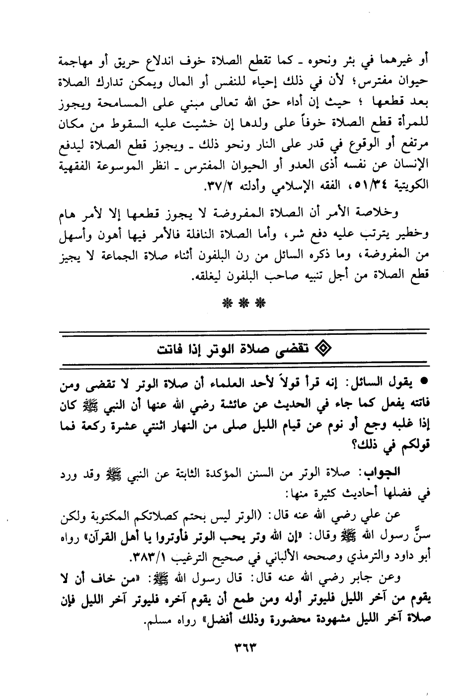 أو غيرهما في بئر ونحوه. كما تقطع الصلاة خوف اندلاع حريق أو مهاجمة حيوان مفترس لأن في ذلك إحياء للنفس أو المال ويمكن تدارك الصلاة بعد قطعها؛ حيث إن أداء حق الله تعالى مبني على المسامحة ويجوز للمرأة قطع الصلاة خوفاً على ولدها إن خشيت عليه السقوط من مكان مرتفع أو الوقوع في قدر على النار ونحو ذلك. ويجوز قطع الصلاة ليدفع الإنسان عن نفسه أذى العدو أو الحيوان المفترس. انظر الموسوعة الفقهية الكويتية34/ 51، الفقه الإسلامي وأدلته 2/ 37.