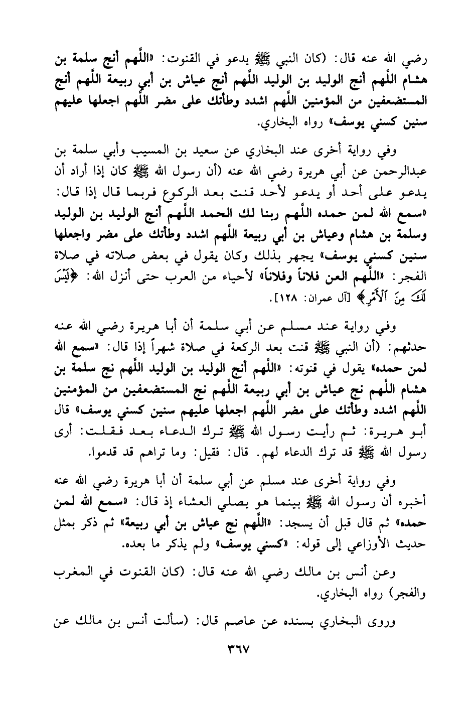 رضي الله عنه - قال: (كان النبي - صَلَّى اللهُ عَلَيْهِ وَسَلَّمَ - يدعو في القنوت اللهم أنج سلمة بن هشام اللهم أنج الوليد بن الوليد اللهم أنج عياش بن أبي ربيعة اللهم أنج المستضعفين من المؤمنين اللهم اشدد وطأتك على مضر اللهم سنين كسني يوسف) رواه البخاري.
