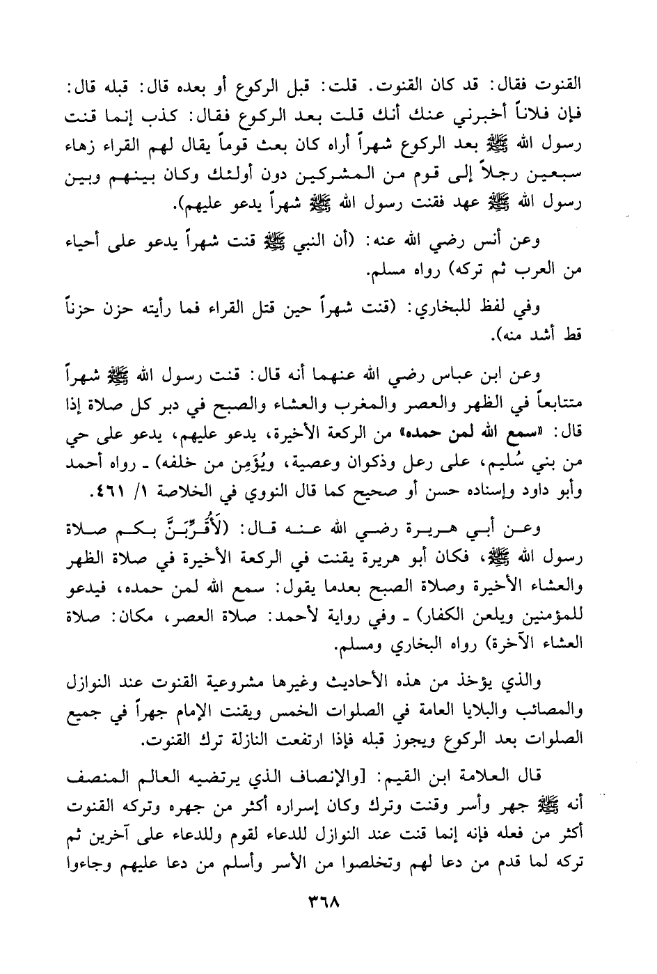 قال العلامة ابن القيم: [والإنصاف الذي يرتضيه العالم المنصف أنه - صَلَّى اللهُ عَلَيْهِ وَسَلَّمَ - جهر وأسر وقنت وترك وكان إسراره أكثر من جهره وتركه القنوت أكثر من فعله فإنه إنما قنت عند النوازل للدعاء لقوم وللدعاء على آخرين ثم تركه لما قدم من دعا لهم وتخلصوا من الأسر وأسلم من دعا عليهم وجاءوا