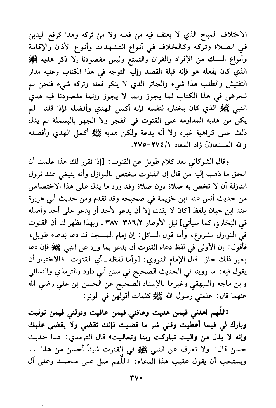 وقال الشوكاني بعد كلام طويل عن القنوت: [إذا تقرر لك هذا علمت أن الحق ما ذهب إليه من قال إن القنوت مختص بالنوازل وأنه ينبغي عند نزول النازلة أن لا تخص به صلاة دون صلاة وقد ورد ما يدل على هذا الاختصاص من حديث أنس عند ابن خزيمة في صحيحه وقد تقدم ومن حديث أبي هريرة عند ابن حبان بلفظ (كان لا يقنت إلا أن يدعو لأحد أو يدعو على أحد وأصله في البخاري كما سيأتي] نيل الأوطار 2/ 386 - 387. وبهذا يظهر لنا أن القنوت في النوازل مشروع، وأما قول السائل إن إمام المسجد قد دعا بدعاء طويل فأقول إن الأولى في لفظ دعاء القنوت أن يدعو بما ورد عن النبي - صَلَّى اللهُ عَلَيْهِ وَسَلَّمَ - فإن دعا بغير ذلك جاز. قال الإمام النووي: [وأما لفظه - أي القنوت - فالاختيار أن يقول فيه: ما روينا في الحديث الصحيح في سنن أبي داود والترمذي والنسائي وابن ماجة والبيهقي وغيرها بالإسناد الصحيح عن الحسن بن علي رضي الله عنهما قال: علمني رسول الله - صَلَّى اللهُ عَلَيْهِ وَسَلَّمَ - كلمات أقولهن في الوتر: