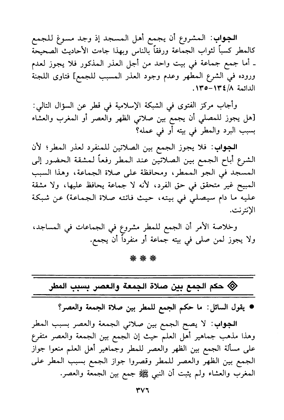 الجواب: المشروع أن يجمع أهل المسجد إذ وجد مسوغ للجمع كالمطر كسباً لثواب الجماعة ورفقاً بالناس وبهذا جاءت الأحاديث الصحيحة. أما جمع جماعة في بيت واحد من أجل العذر المذكور فلا يجوز لعدم وروده في الشرع المطهر وعدم وجود العذر المسبب للجمع] فتاوى اللجنة الدائمة 8/ 134 - 135.
