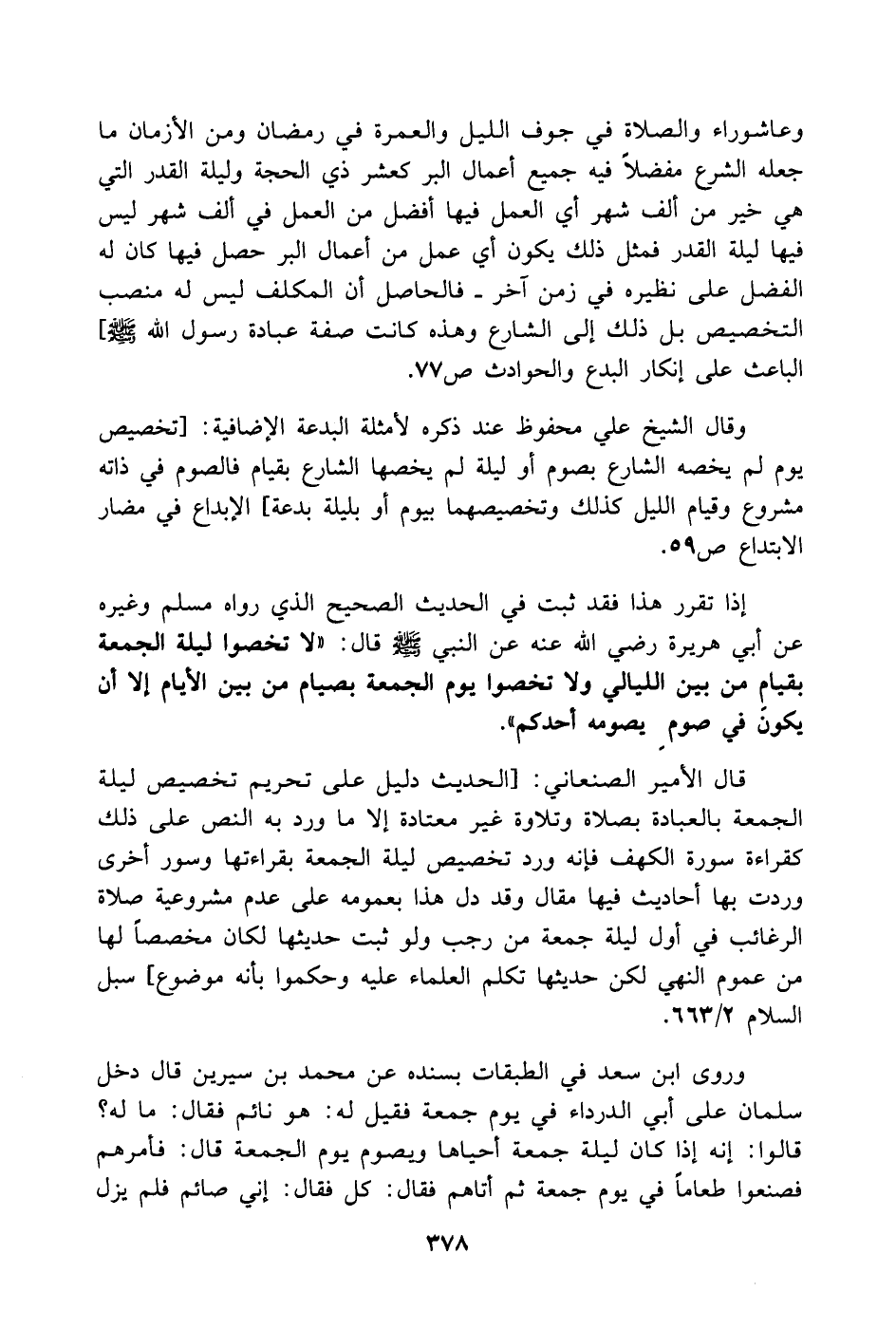 وقال الشيخ علي محفوظ عند ذكره لأمثلة البدعة الإضافية: [تخصيص يوم لم يخصه الشارع بصوم أو ليلة لم يخصها الشارع بقيام فالصوم في ذاته مشروع وقيام الليل كذلك وتخصيصهما بيوم أو بليلة بدعة] الإبداع في مضار الابتداع ص59.