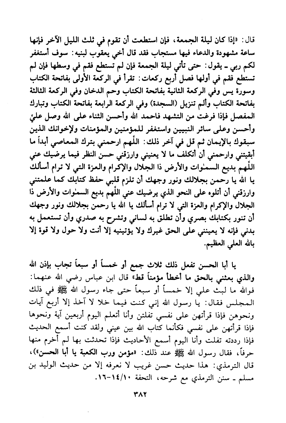 قال إذا كان ليلة الجمعة، فإن استطعت أن تقوم في ثلث الليل الآخر فإنها ساعة مشهودة والدعاء فيها مستجاب فقد قال أخي يعقوب لبنيه: سوف أستغفر لكم ربي. يقول حتى تأتي ليلة الجمعة فإن لم تستطع فقم في وسطها فإن لم تستطع فقم في أولها فصل أربع ركعات: تقرأ في الركعة الأولى بفاتحة الكتاب وسورة يس وفي الركعة الثانية بفاتحة الكتاب وحم الدخان وفي الركعة الثالثة بفاتحة الكتاب وألم تنزيل (السجدة) وفي الركعة الرابعة بفاتحة الكتاب وتبارك المفصل فإذا فرغت من التشهد فاحمد الله وأحسن الثناء على الله وصل عليَّ وأحسن وعلى سائر النبيين واستغفر للمؤمنين والمؤمنات ولإخوانك الذين سبقوك بالإيمان ثم قل في آخر ذلك: اللهم ارحمني بترك المعاصي أبداً ما أبقيتني وارحمني أن أتكلف ما لا يعنيني وارزقني حسن النظر فيما يرضيك عني اللهم بديع السموات والأرض ذا الجلال والإكرام والعزة التي لا ترام أسألك يا الله يا رحمن بجلالك ونور وجهك أن تلزم قلبي حفظ كتابك كما علمتني وارزقني أن أتلوه على النحو الذي يرضيك عني اللهم بديع السموات والأرض ذا الجلال والإكرام والعزة التي لا ترام أسألك يا الله يا رحمن بجلالك ونور وجهك أن تنور بكتابك بصري وأن تطلق به لساني وتشرح به صدري وأن تستعمل به بدني فإنه لا يعينني على الحق غيرك ولا يؤتينيه إلا أنت ولا حول ولا قوة إلا بالله العلي العظيم.