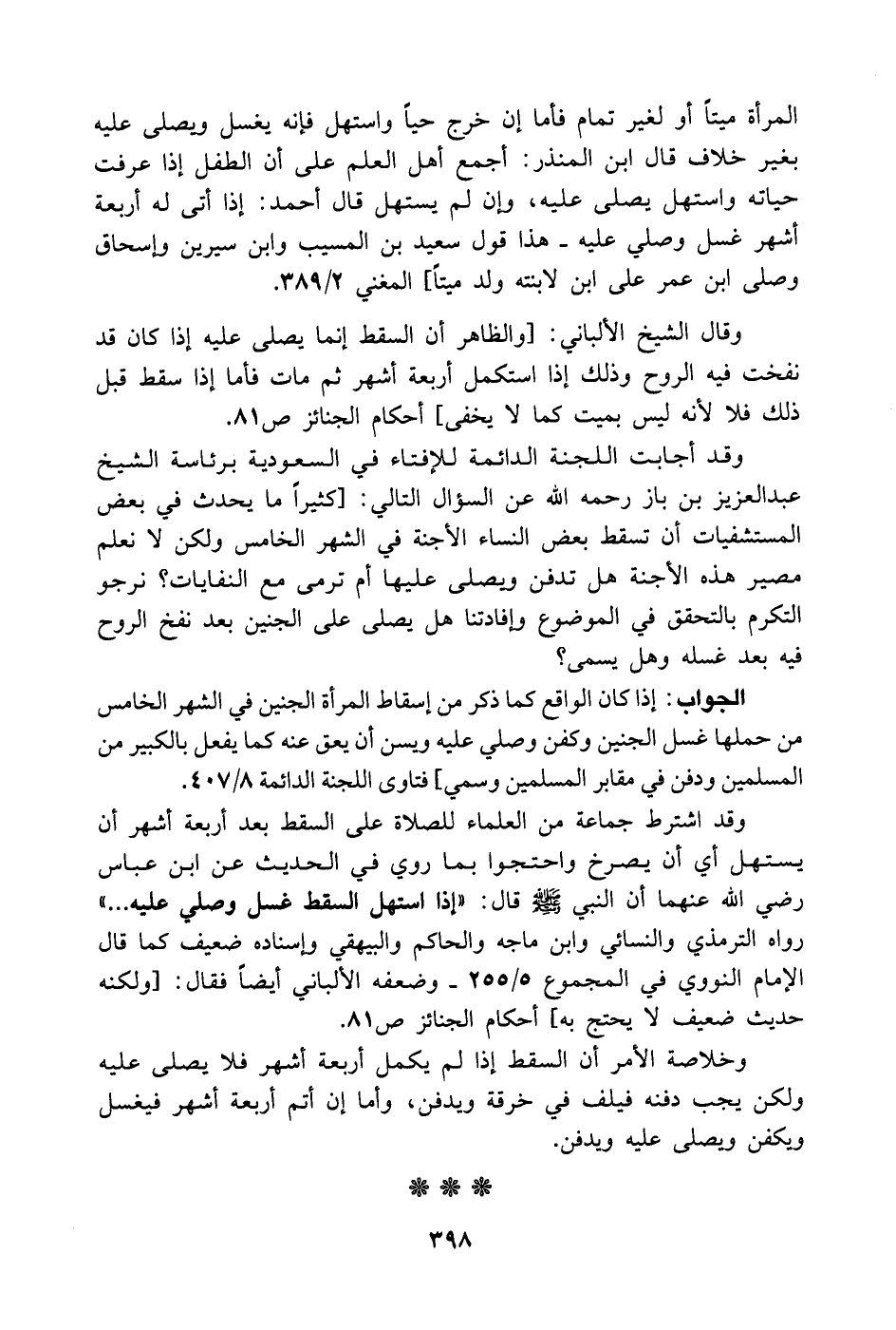 وقال الشيخ الألباني: [والظاهر أن السقط إنما يصلى عليه إذا كان قد نفخت فيه الروح وذلك إذا استكمل أربعة أشهر ثم مات فأما إذا سقط قبل ذلك فلا لأنه ليس بميت كما لا يخفى] أحكام الجنائز ص81.