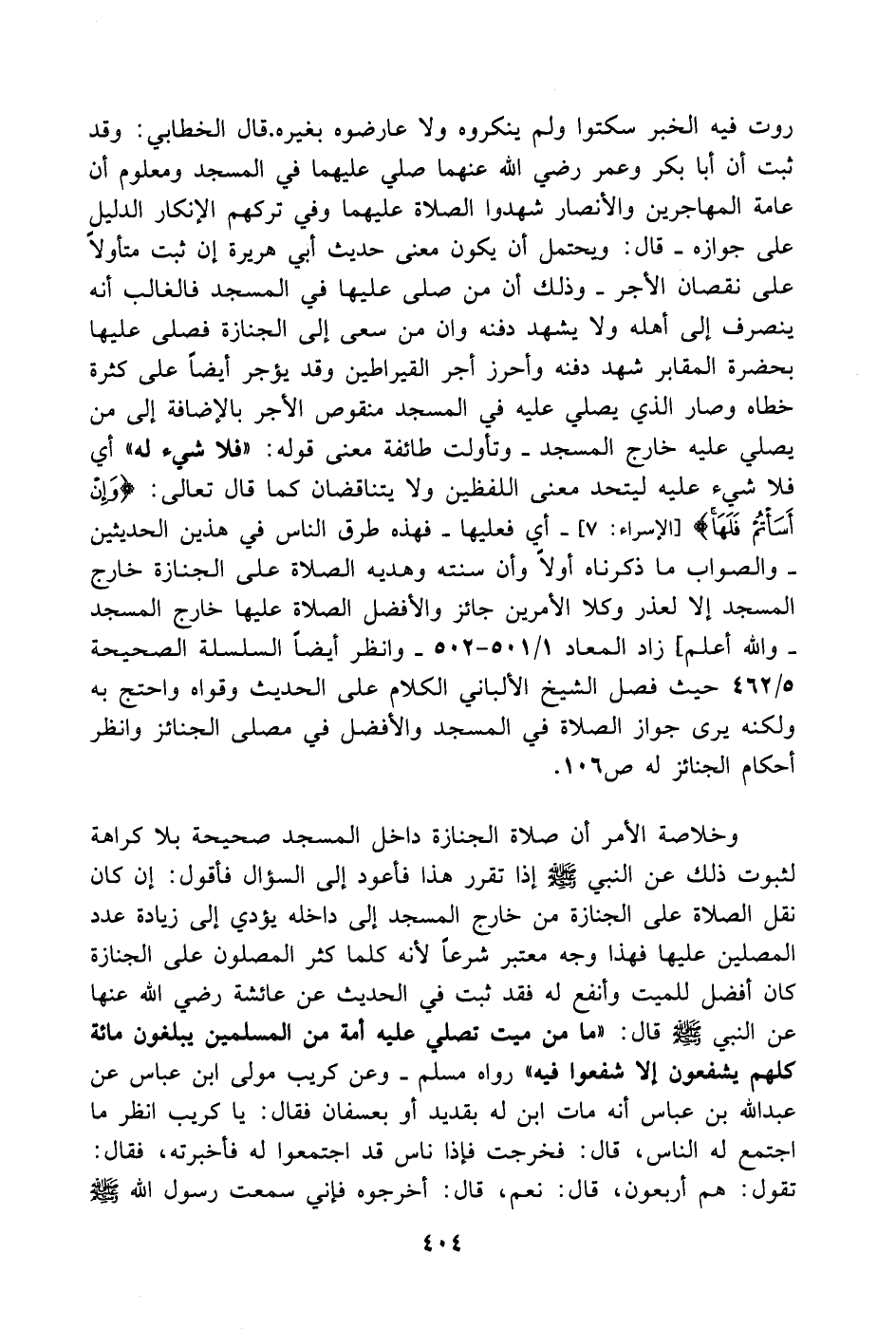 روت فيه الخبر سكتوا ولم ينكروه ولا عارضوه بغيره. قال الخطابي: وقد ثبت أن أبا بكر وعمر رضي الله عنهما صلي عليهما في المسجد ومعلوم أن عامة المهاجرين والأنصار شهدوا الصلاة عليهما وفي تركهم الإنكار الدليل على جوازه. قال: ويحتمل أن يكون معنى حديث أبي هريرة إن ثبت متأولاً على نقصان الأجر. وذلك أن من صلى عليها في المسجد فالغالب أنه ينصرف إلى أهله ولا يشهد دفنه وان من سعى إلى الجنازة فصلى عليها بحضرة المقابر شهد دفنه وأحرز أجر القيراطين وقد يؤجر أيضاً على كثرة خطاه وصار الذي يصلي عليه في المسجد منقوص الأجر بالإضافة إلى من يصلي عليه خارج المسجد. وتأولت طائفة معنى قوله: (فلا شيء له) أي فلا شيء عليه ليتحد معنى اللفظين ولا يتناقضان كما قال تعالى: (وَإِنْ أَسَأْتُمْ فَلَهَا) سورة الإسراء الآية 7. أي فعليها. فهذه طرق الناس في هذين الحديثين. والصواب ما ذكرناه أولاً وأن ......