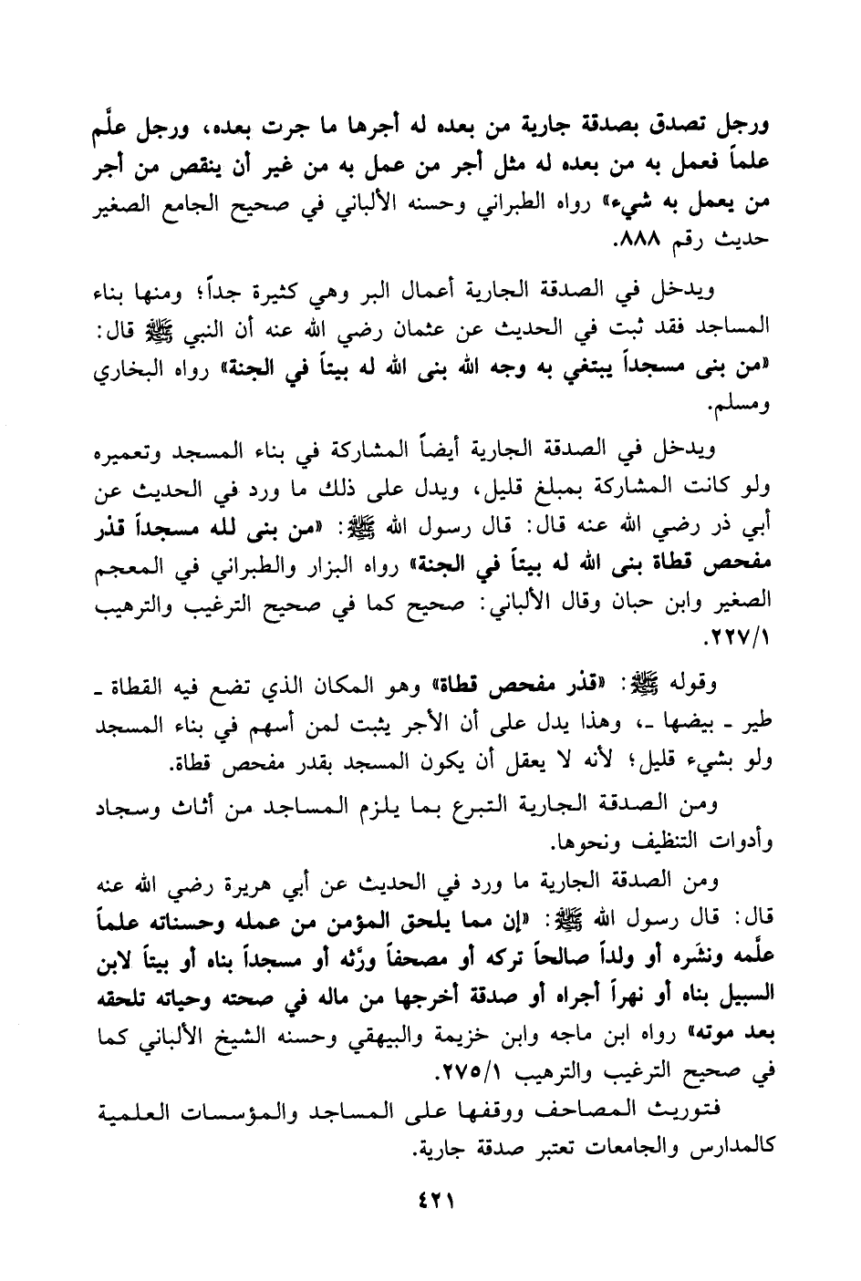 ويدخل في الصدقة الجارية أيضاً المشاركة في بناء المسجد وتعميره ولو كانت المشاركة بمبلغ قليل ويدل على ذلك ما ورد في الحديث عن أبي ذر - رضي الله عنه - قال: قال رسول الله - صَلَّى اللهُ عَلَيْهِ وَسَلَّمَ -: (من بنى لله مسجداً قدْر مفحص قطاة بنى الله له بيتاً في الجنة) رواه البزار والطبراني في المعجم الصغير وابن حبان وقال الألباني صحيح كما في صحيح الترغيب والترهيب 1/ 227.