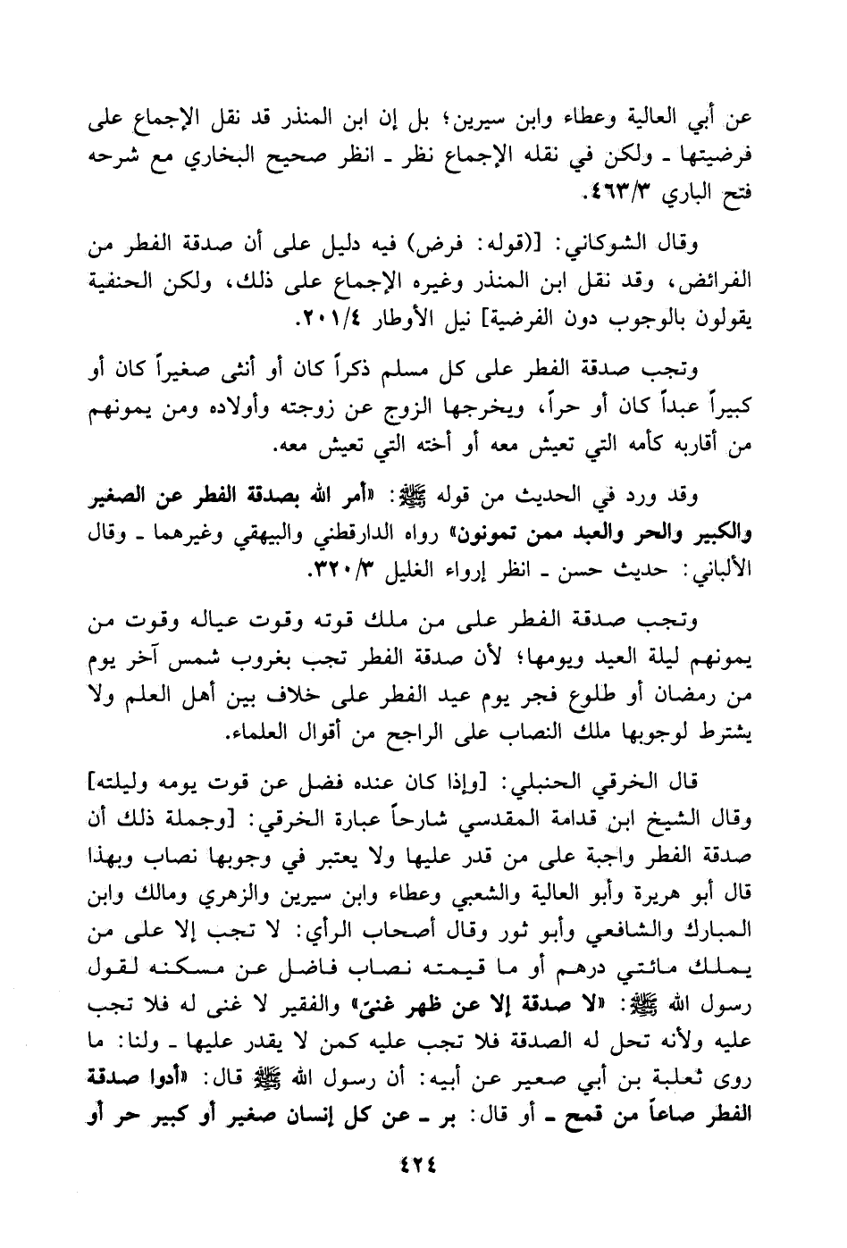 وقال الشوكاني: [(قوله فرض) فيه دليل على أن صدقة الفطر من الفرائض وقد نقل ابن المنذر وغيره الإجماع على ذلك، ولكن الحنفية يقولون بالوجوب دون الفرضية] نيل الأوطار 4/ 201.